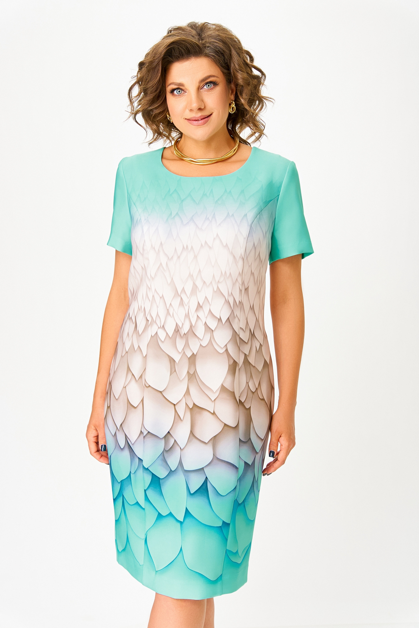 Платье полуприлегающего силуэта из мягкой поливискозной ткани с оригинальным дизайнерским принтом. По полочке выполнены рельефные швы, по спинке рельефные швы, средний шов со шлицей и застёжкой на потайную тесьму-молнию. Горловина круглая, обработана обтачкой. Рукав втачной, короткий.