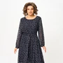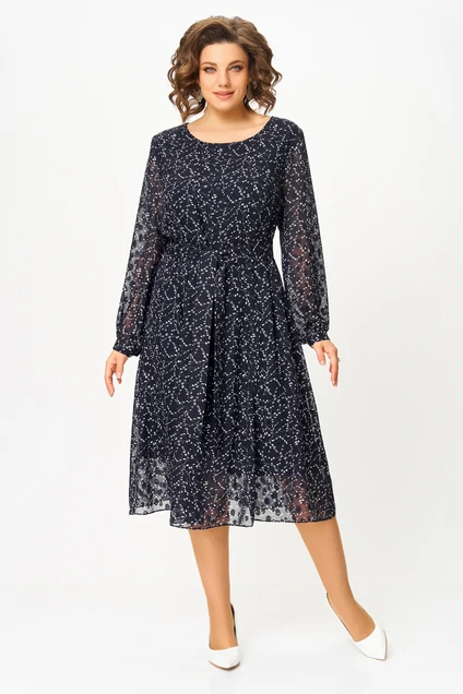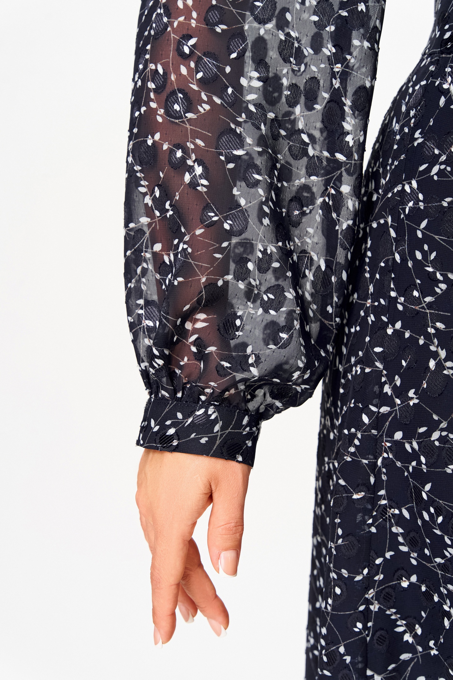 Платье полуприлегающего силуэта из фактурной шифоновой ткани с тиснёным узором на трикотажной подкладке. Полочка с отрезными рельефами, спинка с центральным швом и рельефами. Горловина округлой формы. Рукав втачной, длинный внизу со сборкой и манжетой, которая застёгивается на петлю и пуговицу.