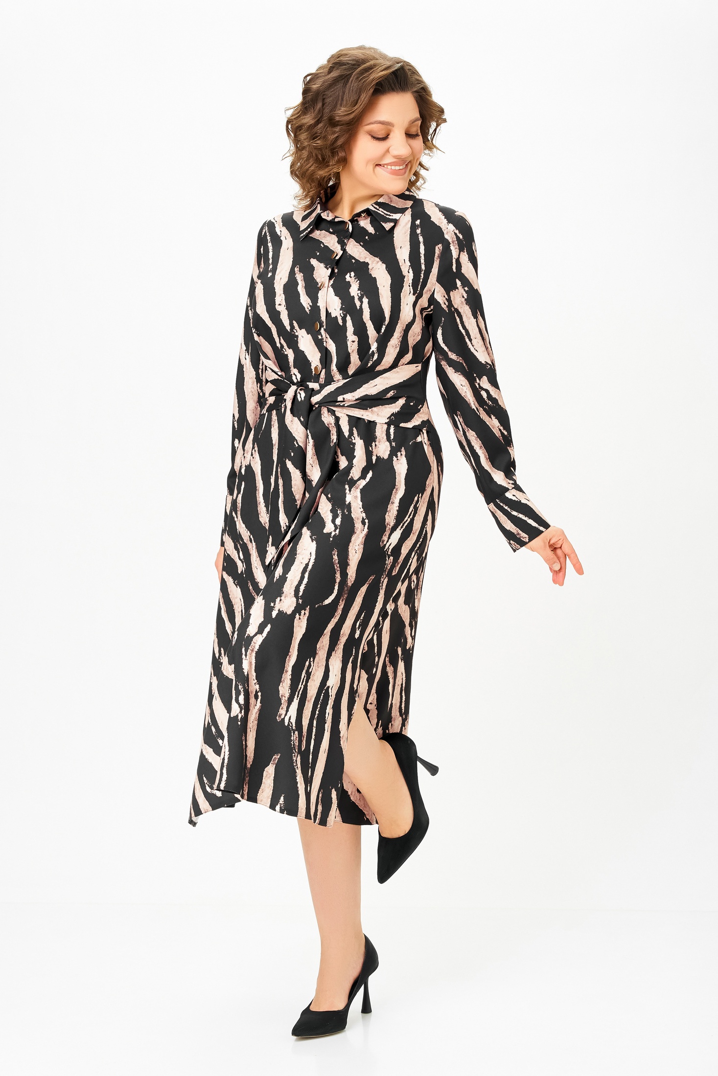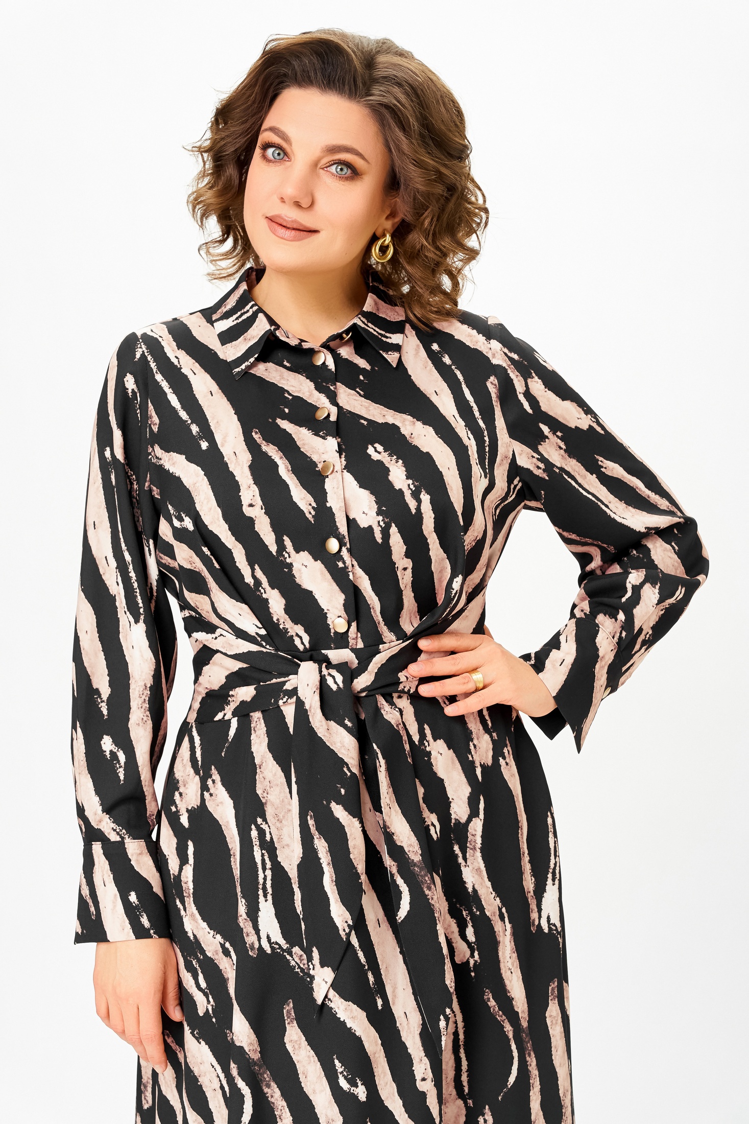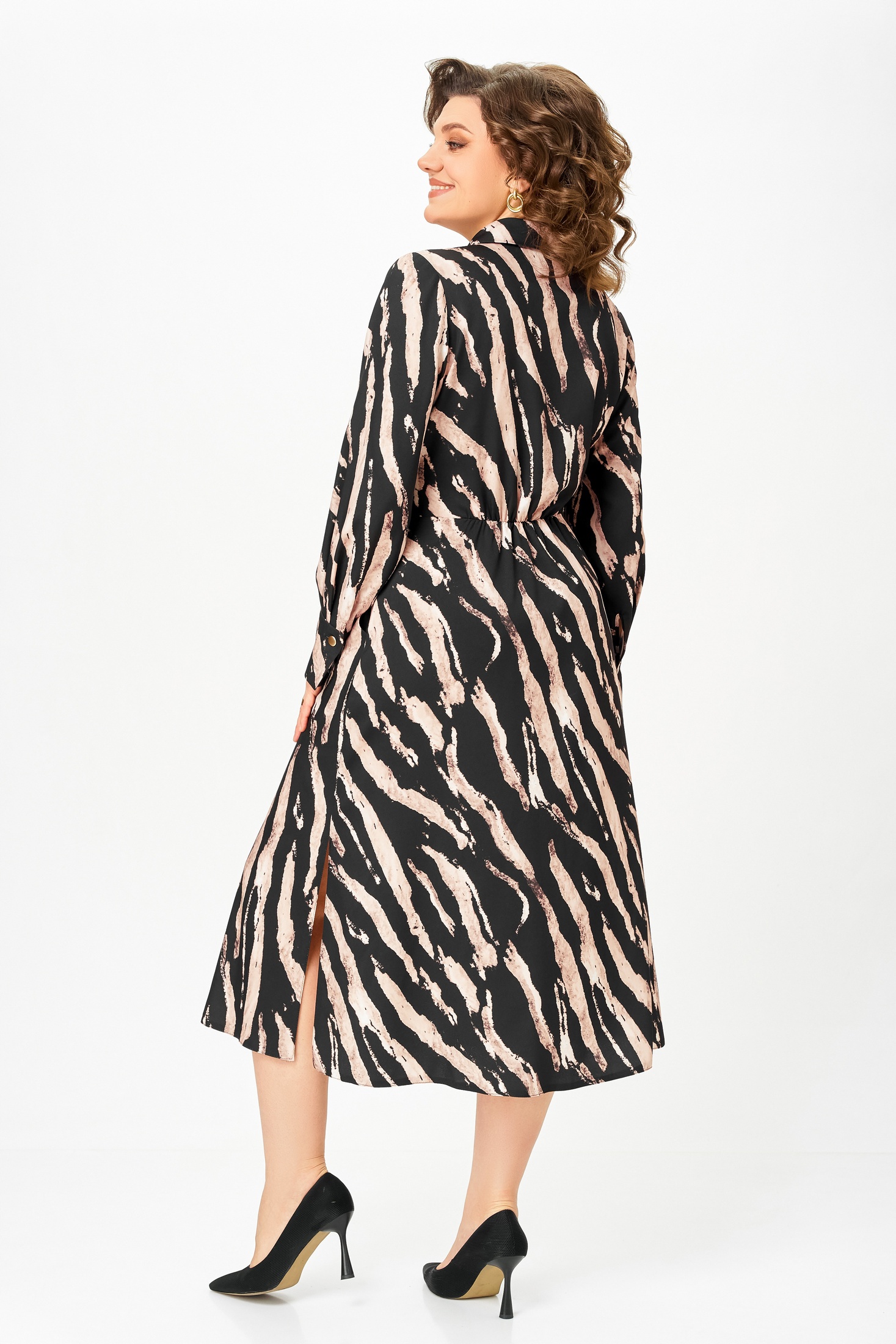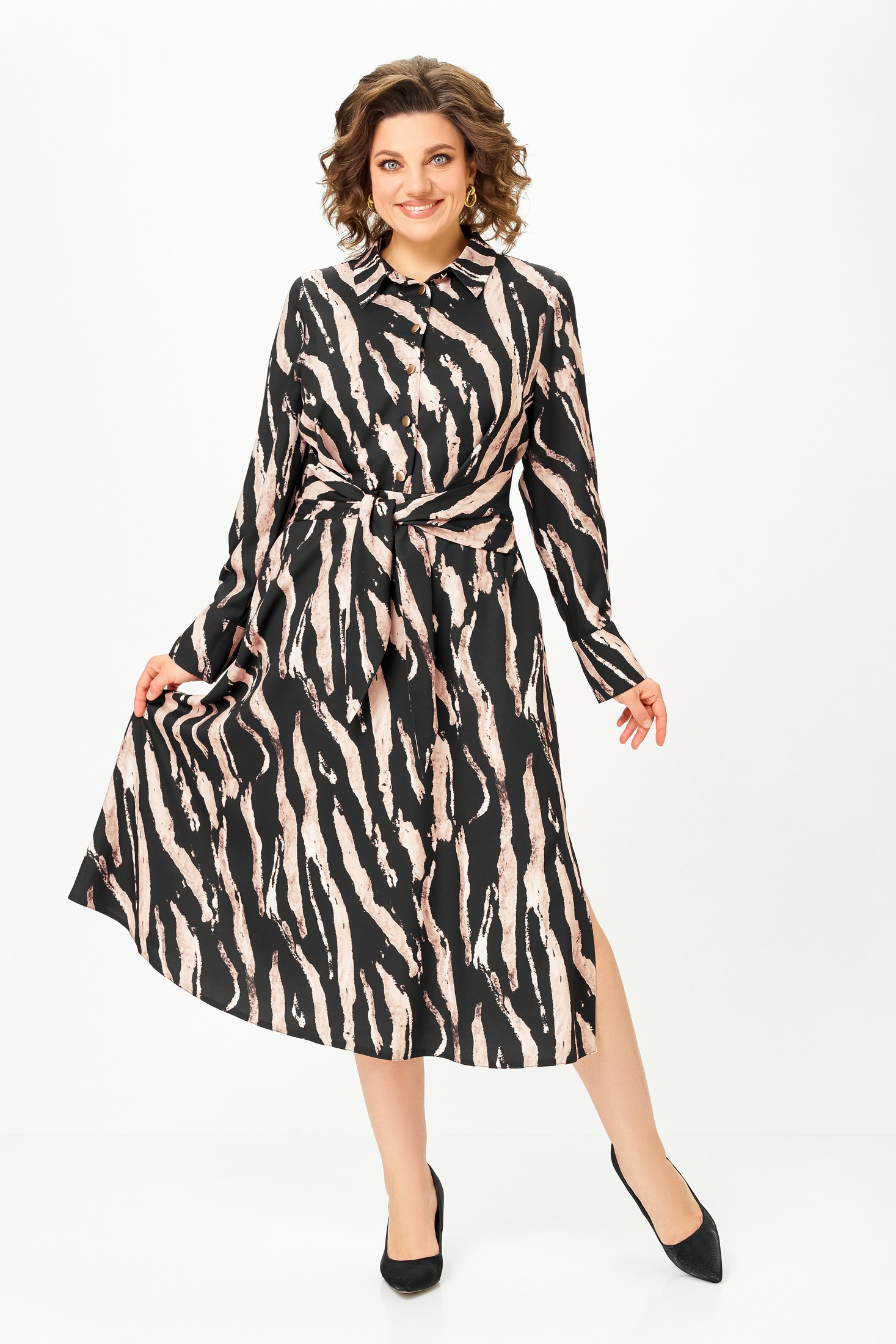 Платье 887-2 Swallow из коллекции бренда Swallow — идеальное сочетание комфорта и стиля. Выполнено из мягкой вискозы с добавлением полиэстера и эластана, что обеспечивает приятное прилегание и свободу движений. Х-образный силуэт с полуприлегающим лифом и отрезной талией подчеркивают фигуру, а длинные рукава и воротник рубашечного типа добавляют строгого шарма. Удобные карманы и регулируемые манжеты делают это платье практичным выбором для осени. Яркий принт добавляет индивидуальности, идеально для рабочей обстановки и повседневной носки. Длина по спинке — 124 см, длина рукава — 65 см.