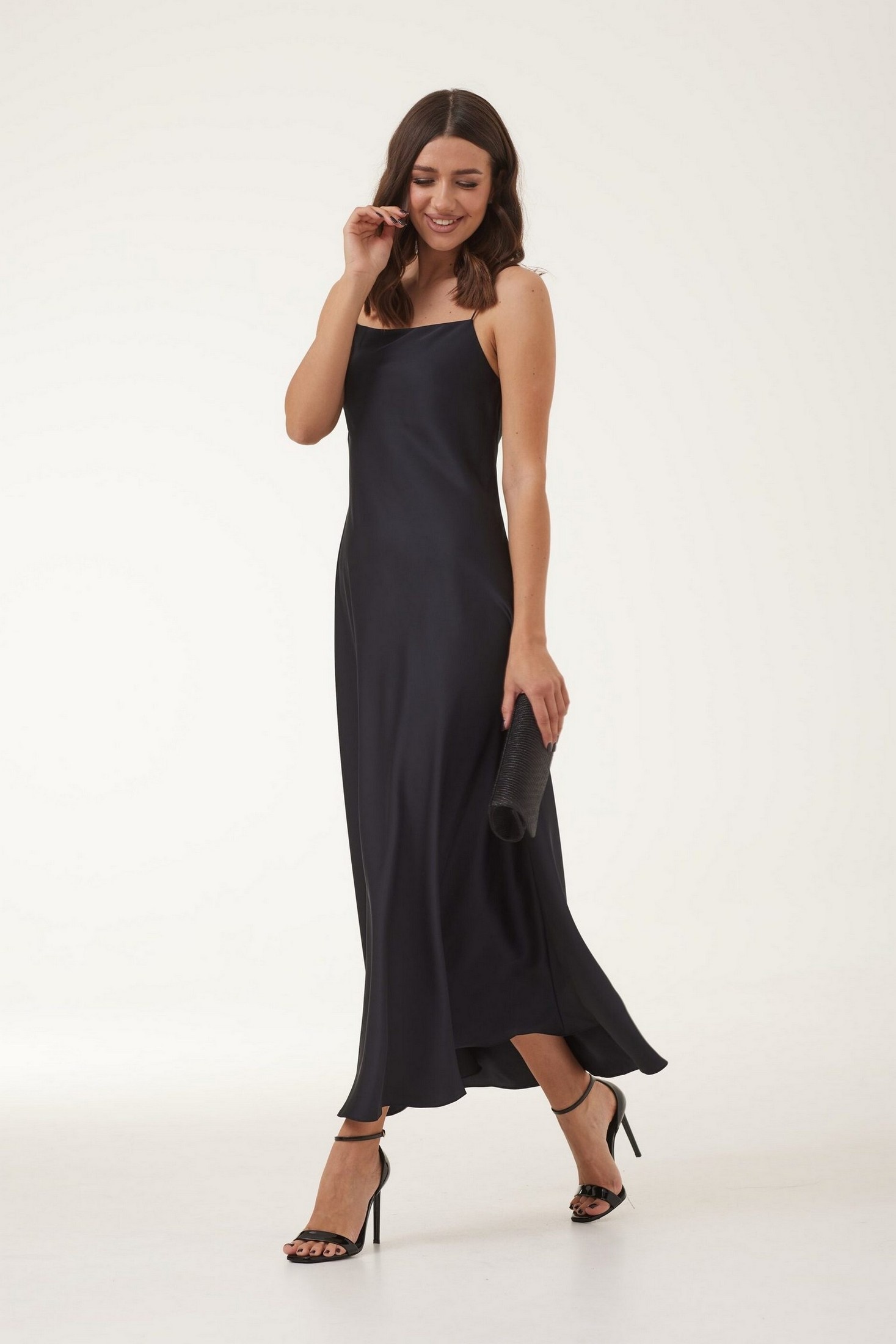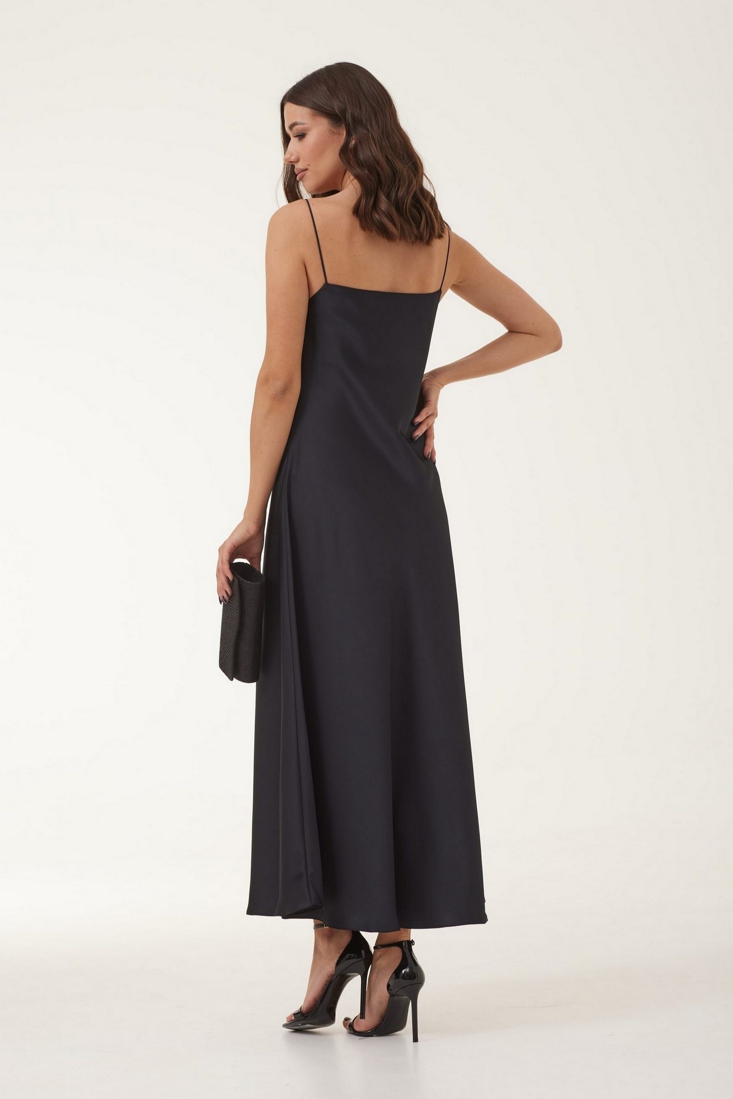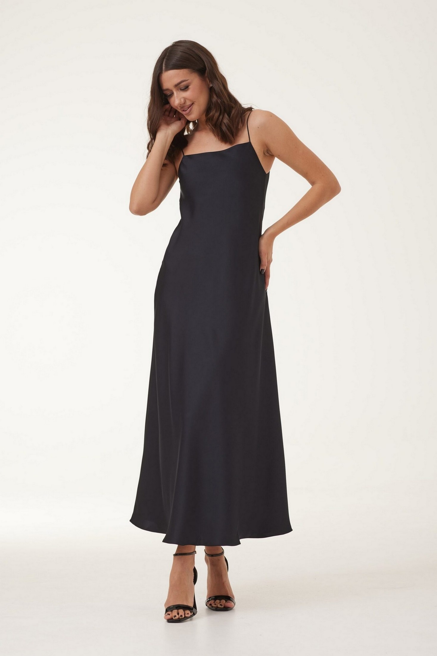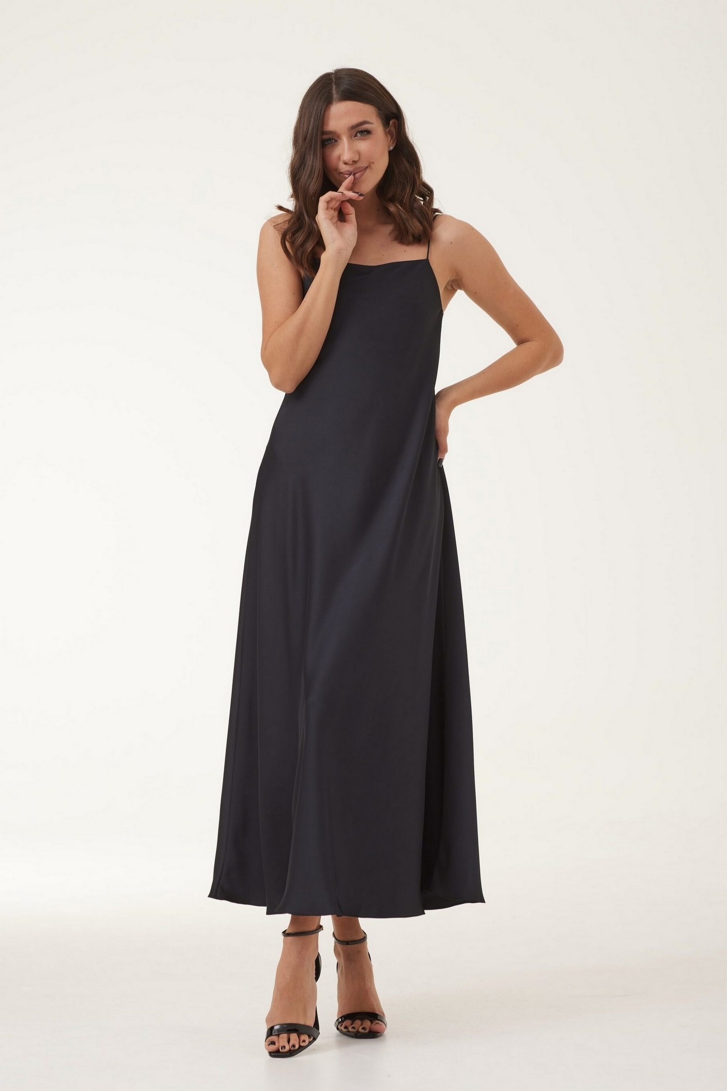 Платье женское полуприлегающего силуэта, длиной макси, выполнено из сатиновой ткани. Платье на нерегулируемых бретелях. Длина изделия 135 см.