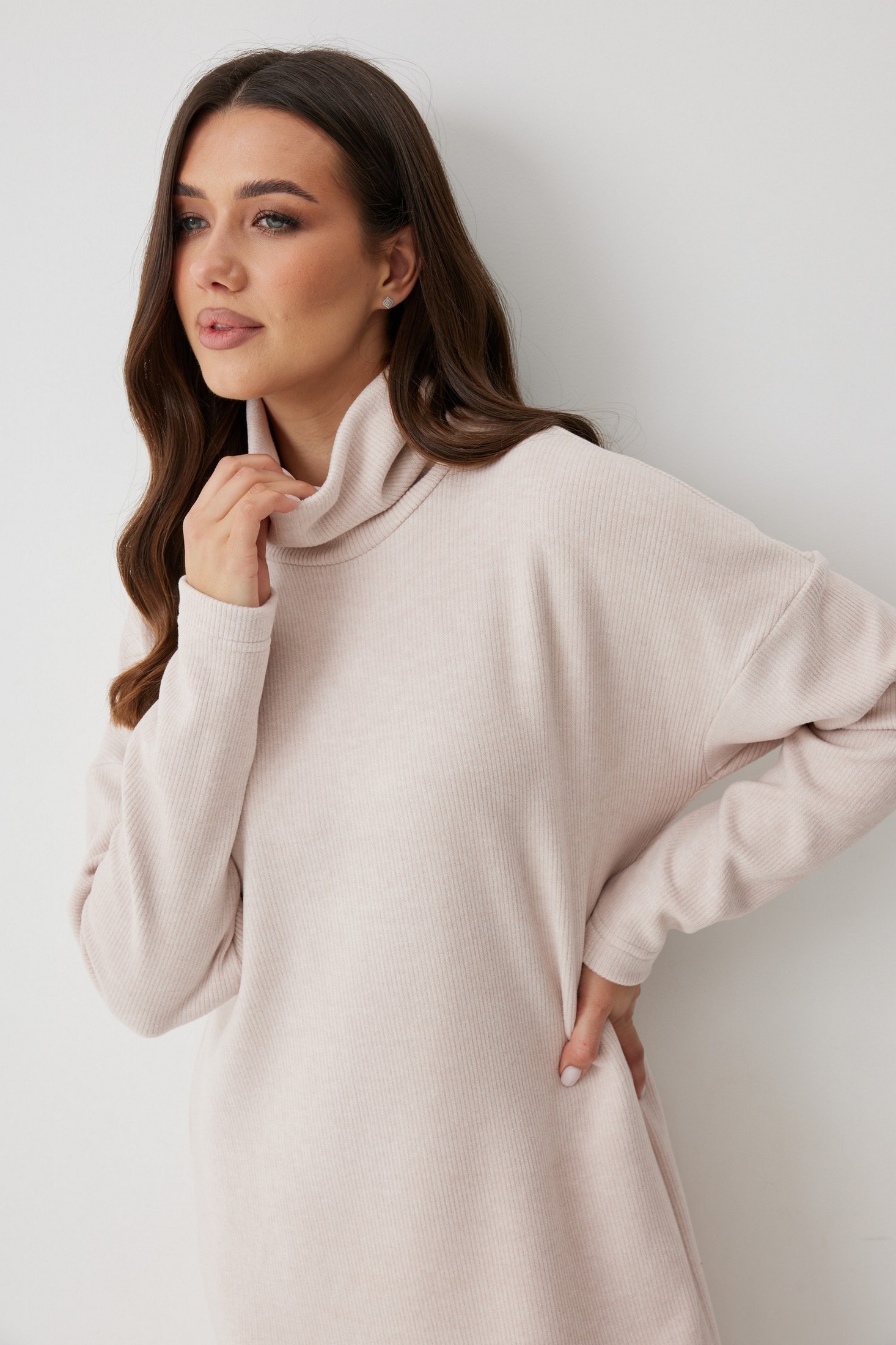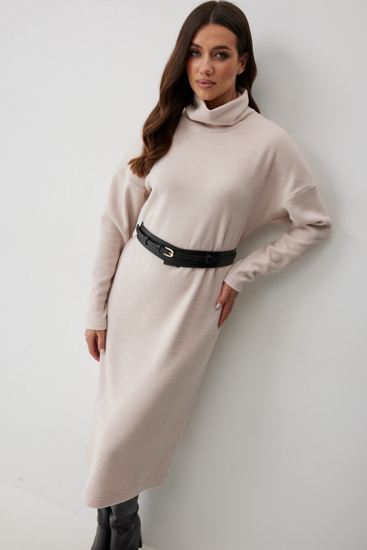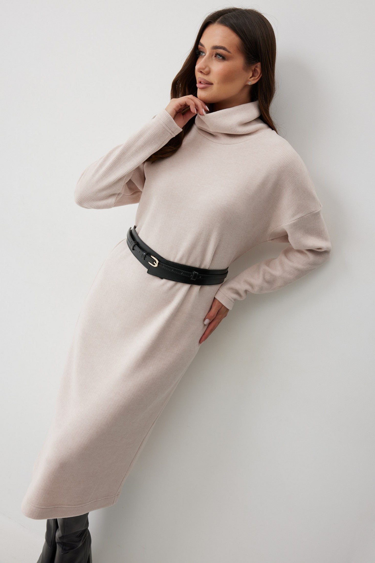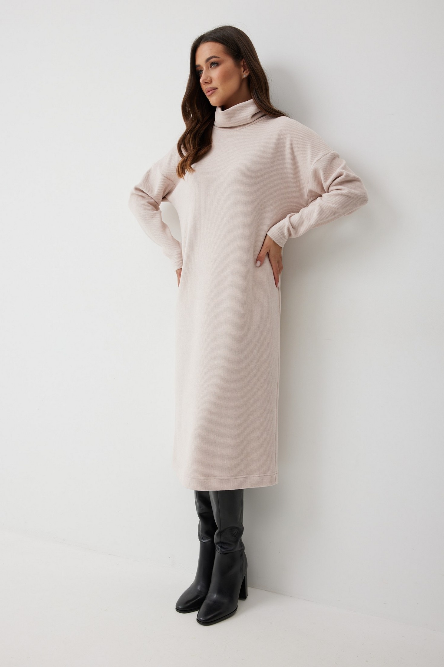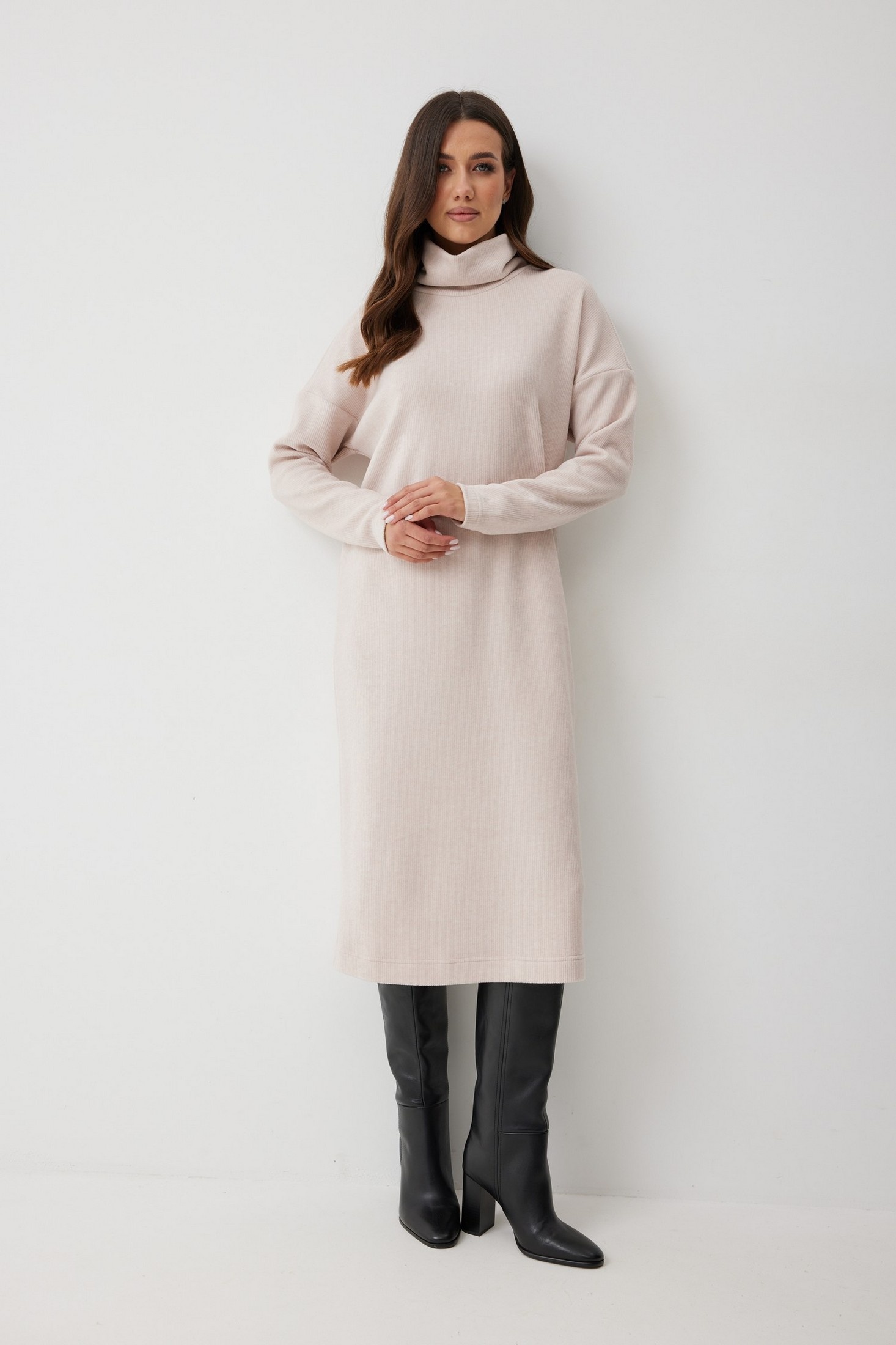 Трикотажное платье прямого силуэта, сочетающее в себе максимальный комфорт и актуальный минималистичный дизайн. Модель выполнена из мягкого трикотажного полотна с рубчиком, что добавляет фактурности и мягкости. Горловина с высокой воротником - стойкой (15 см), который выглядит стильно и дарит дополнительное тепло. Благодаря прямому силуэту, платье обеспечивает свободную и универсальную посадку. Спущенная линия плеча и длинный рукав, чуть зауженный к низу, создают расслабленный и уютный объем. Это платье станет незаменимой основой вашего осенне-зимнего гардероба, легко адаптируясь под любой стиль с помощью аксессуаров и обуви.