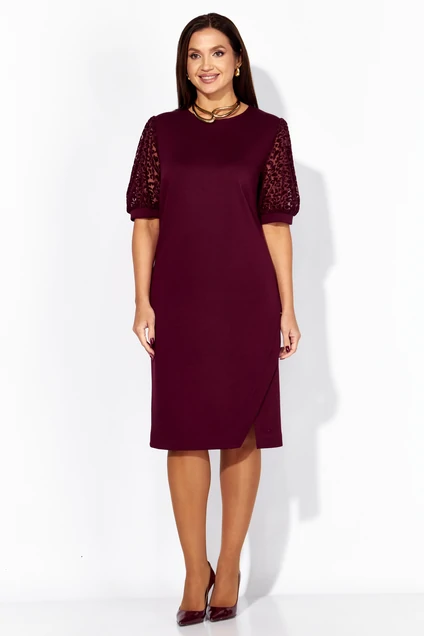 Платье женское, полуприлегающего силуэта с коротким рукавом. Рукав типа "фонарик" со сборкой сверху и снизу. По низу притачная манжета. По переду нагрудные вытачки. Горловина круглой формы. По низу асимметричная, отлетная планка с разрезом и декоративная нашивка. По спинке средний шов с разрезом снизу и талевые вытачки. Горизонтальный подрез выше линии талии. Верхняя часть спинки и рукав выполнены из ткани сетка с флоковым нанесением. Застежка на потайную "молнию"