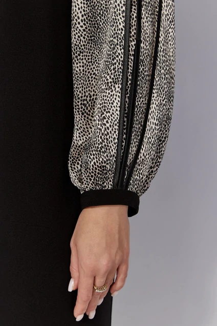 Платье женское, полуприлегающего силуэта с длинным втачным рукавом. Низ рукава присобран на манжету. По центру рукава вертикальные подрезы, оформленные контрастной окантовкой. По переду наклонные нагрудные вытачки. Вырез горловины круглой формы. Декором служит съемная брошь-цветок.По спинке средний шов с застежкой на потайную тесьму "молния" и разрезом по низу.