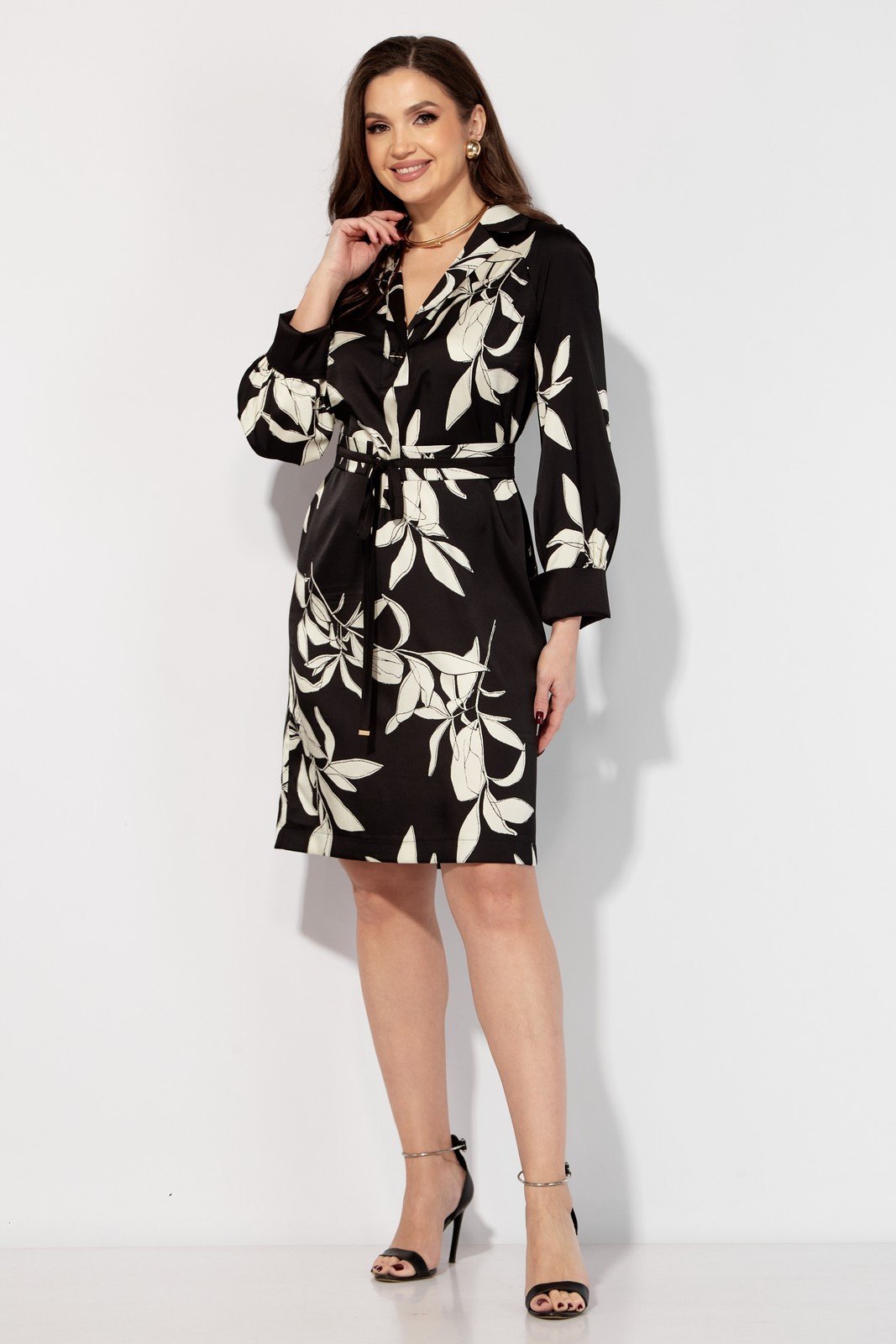 Элегантное женское платье прямого силуэта, отлично подходящее для офиса или вечернего выхода. Платье выполнено в черном цвете с ярким белым растительным принтом, который придает образу свежесть и утонченность. Модель дополнена длинными рукавами реглан, которые собраны внизу на широкий манжет с разрезом, что позволяет регулировать длину рукава. Отложной воротник с лацканами украшен отделочной пуговицей, добавляя изысканности дизайну. По центру спинки мягкая встречная складка подчеркивает линию талии, а оригинальный пояс акцентирует её, подчеркивая фигуру. Это платье идеально сочетает в себе стиль и практичность, будучи идеальным выбором для современной женщины.