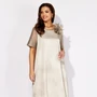 Женское платье в песочном цвете представляет собой прямой силуэт с длинными рукавами, идеально подходящее для создания элегантного образа в прохладное время года. Рукава данной модели имеют спущенную линию плеча и заканчиваются манжетами, добавляющими форму. Утонченную нотку вносит высокая, мягкая стойка в районе горловины, идеально дополняющая общий вид. Особенный акцент — декоративная сточка у разреза на боку, которая добавляет изделию динамичности и уникальности. Это роскошный выбор для тех, кто ценит комфорт и стиль.