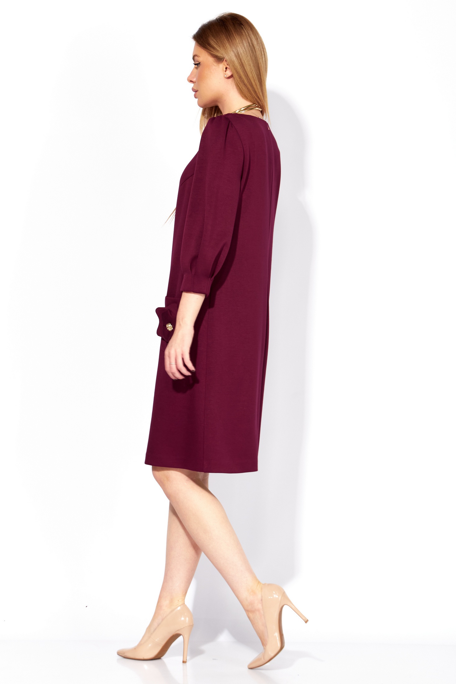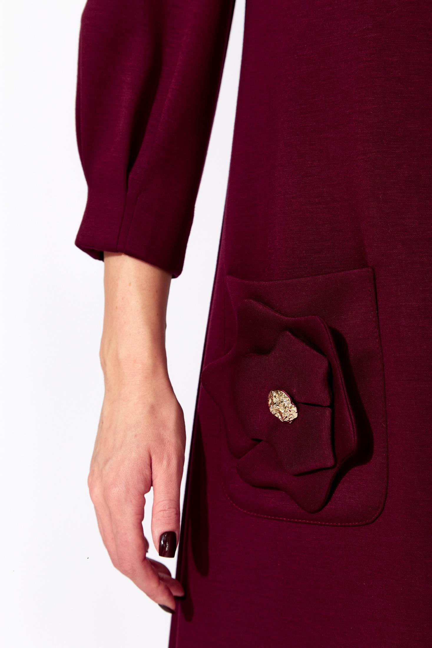 Элегантное женское платье А-силуэта выполнено в насыщенном бордовом цвете. Модель дополнена рукавами длиной 3/4 с втачной конструкцией, декорированы мягкими складками у манжет и сборкой по окату, что добавляет образу нотку романтичности. Круглая горловина подчеркивает изящество линии шеи. Практичные накладные карманы на передней части платья украшены стилистическими цветами с декоративными элементами, придавая визуальный акцент. Нагрудные вытачки отлично сидят по фигуре, обеспечивая идеальную посадку. Изысканный элемент в виде нашивки добавлен на средний шов по спинке, дополняя общий вид платья. Это платье станет изысканным дополнением к гардеробу для любого события.