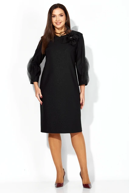 Платье женское, прямого силуэта, выполнено из ткани поливискоза "SHANE" со стрейчем. Рукав втачной , длинной 7/8. Нижняя часть рукава задекорирована фантазийными элементами из огранзы. По переду нагрудные вытачки из пройм. Вырез горловины круглой формы. По спинке средний шов и застежка на потайную тесьму "молния" Украшение, в виде крупного цветка из органзы, съемное.
