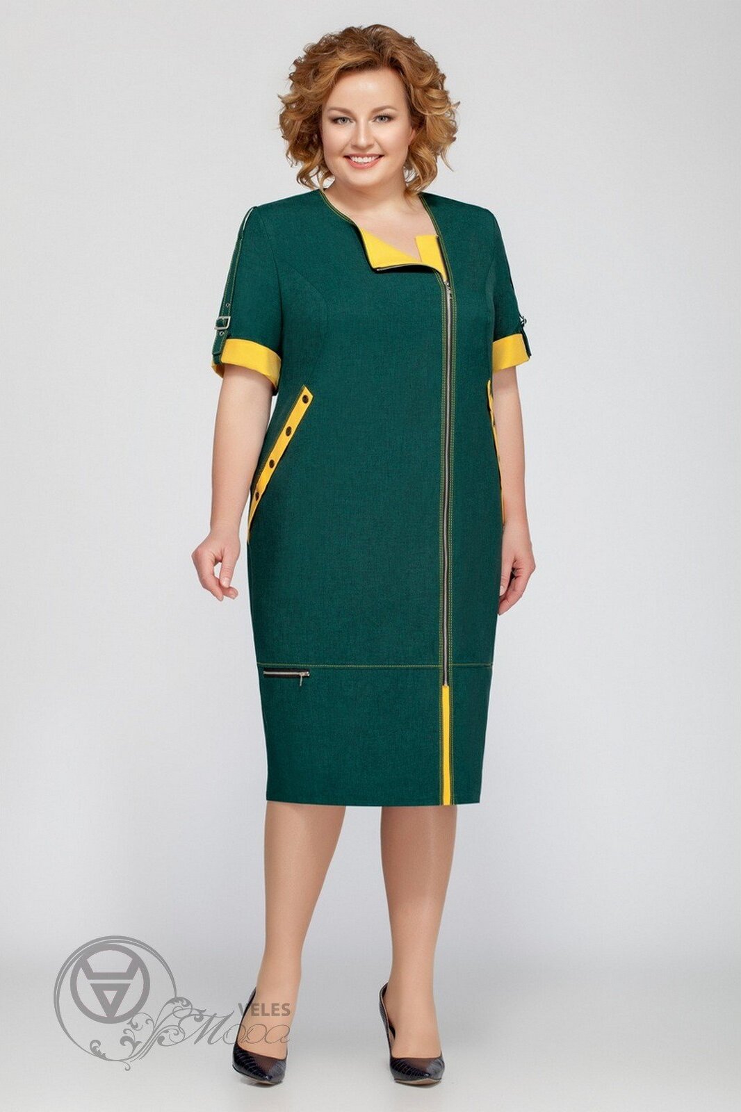 Женское платье с коротким рукавом и заметной асимметричной застёжкой-молнией. По переду в фигурные швы вставлены отделочные детали из контрастной ткани с пришитыми на них пуговицами. Рукава с отворотами из контрастной ткани, закреплённые патой с пряжкой. Длина рукава ок. 28 см. Длина платья 48-54 р-р ок. 104 см. Длина платья 56 р-р ок. 107 см. Длина платья 58 р-р ок. 110 см. Длина платья 60-62 р-р ок. 112 см.