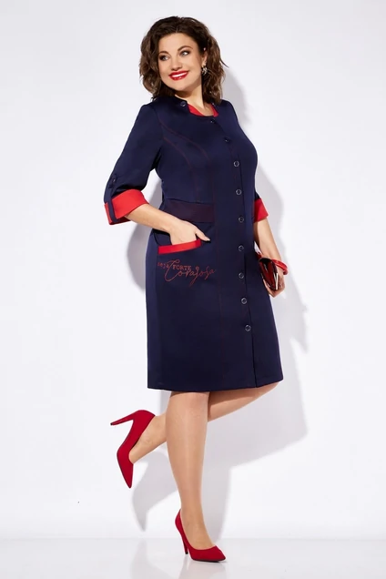 Вырез горловины округлый оформлен фигурными бейками. По центру платья выполнена застежка на планку с петлями-пуговицами. На уровне талии расположен отделочный элемент вставка с выполненными по нему отделочными строчками. На уровне бедер выполнены карманы оформленные входом с листочкой контрастного цвета. По переду и спинке выполнены рельефы.