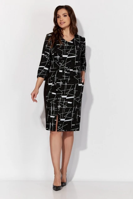 Это женское платье из трикотажа с геометрическим дизайном и изысканной отделкой из черного трикотажа — воплощение стиля и современности. Прямой силуэт этого платья с черными бочками придает образу изысканности и строгости, а геометрический дизайн добавляет контраста и индивидуальности.
