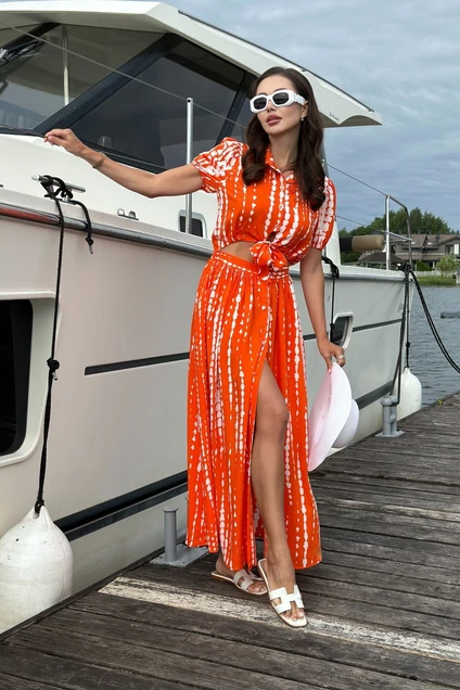 Легкое платье из хлопкового полотна, длиной макси, имитирующее костюм.Ссзастежкой на пуговицы по переду, отрезное по линии талии, верхняя часть по переду завязывается. Рубашечный воротник, рукав короткий на резинке по низу. По спинке пояс отрезной с резинкой. Длина платья 145см,лина рукава 25см
