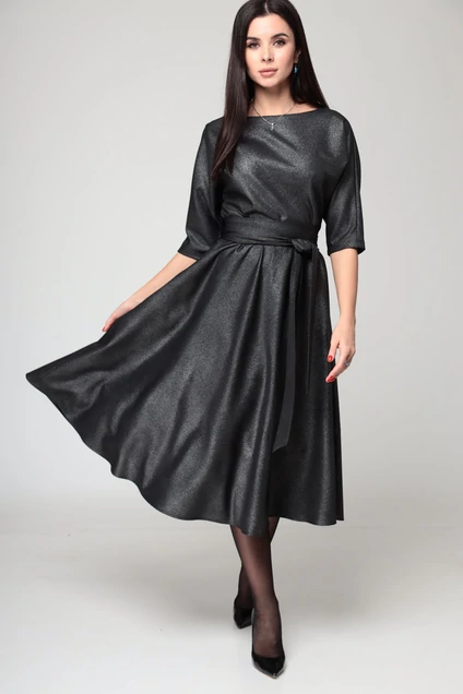 Нарядное платье из непрозрачной плотной ткани. Лиф «летучая мышь». Летящая юбка «полусолнце», по талии эластичная тесьма. Без застежки. Горловина овальная. Рукав ниже локтя зауженный к низу. Пояс длинный завязывается на талии.