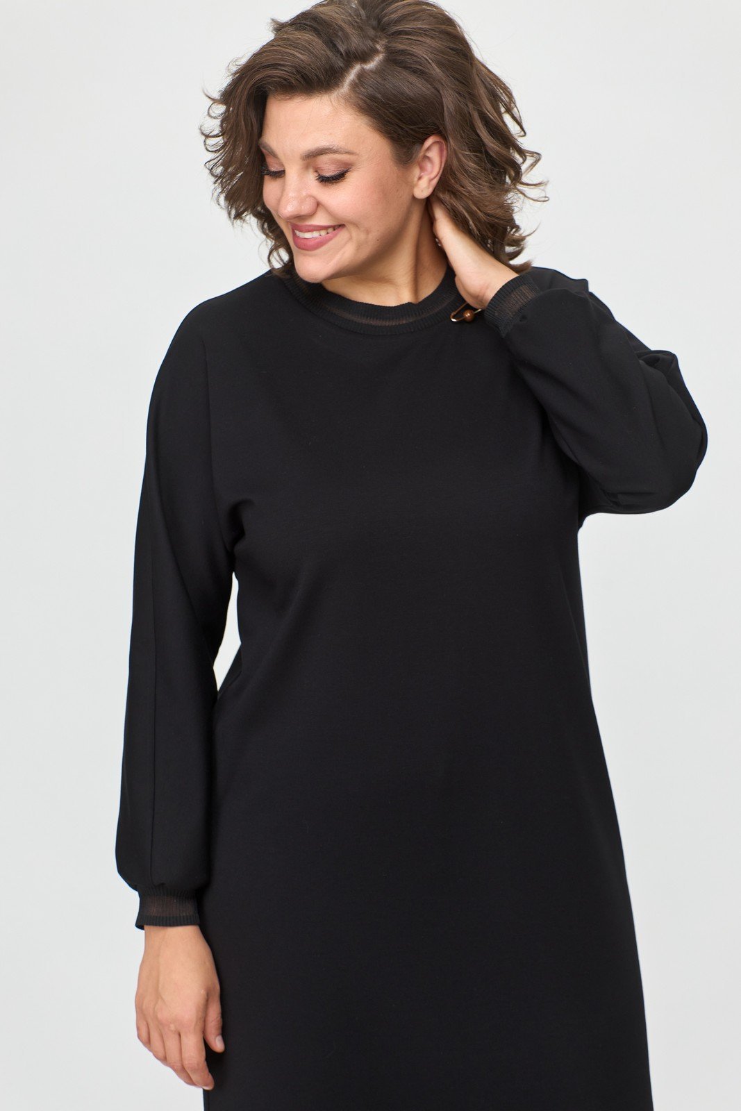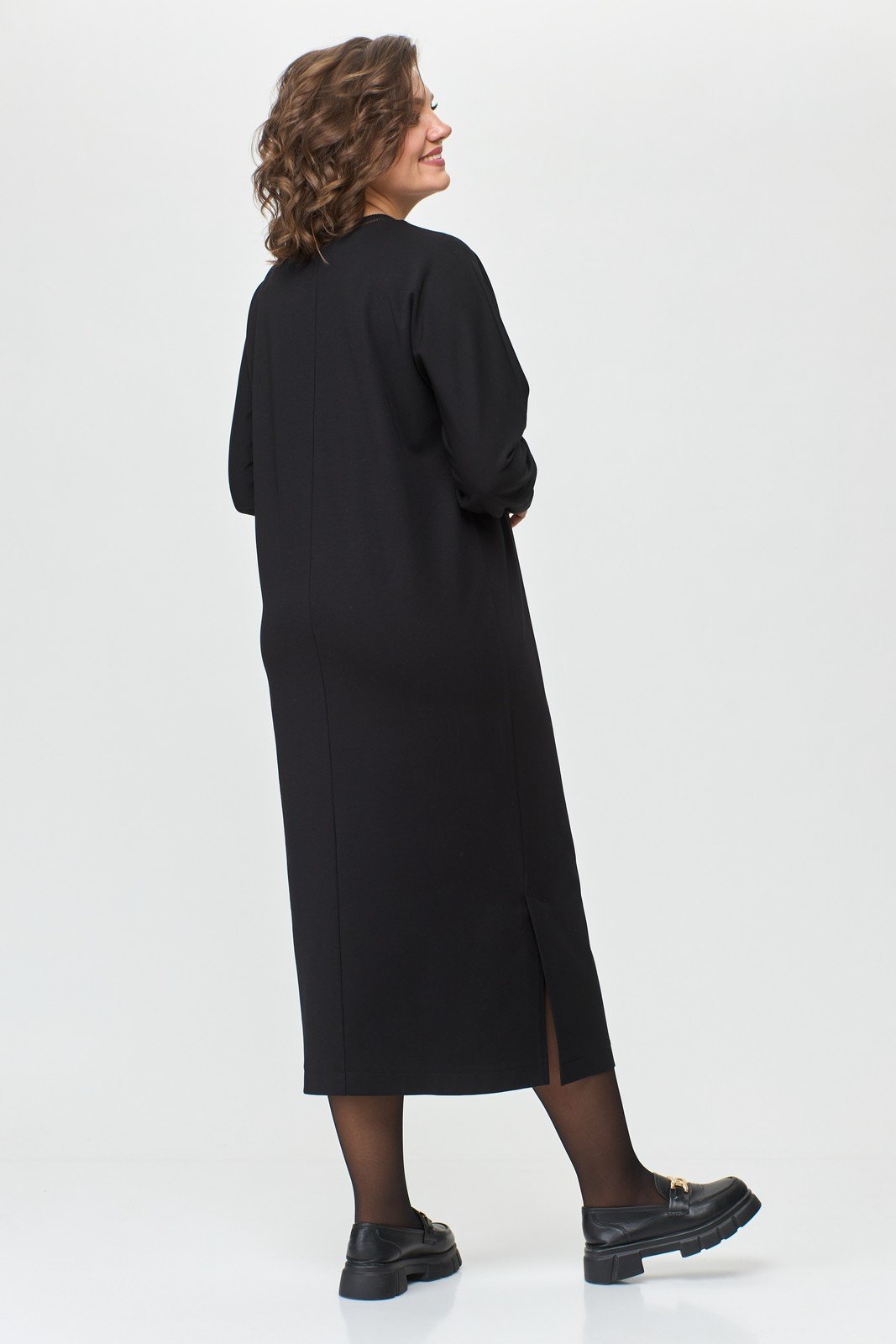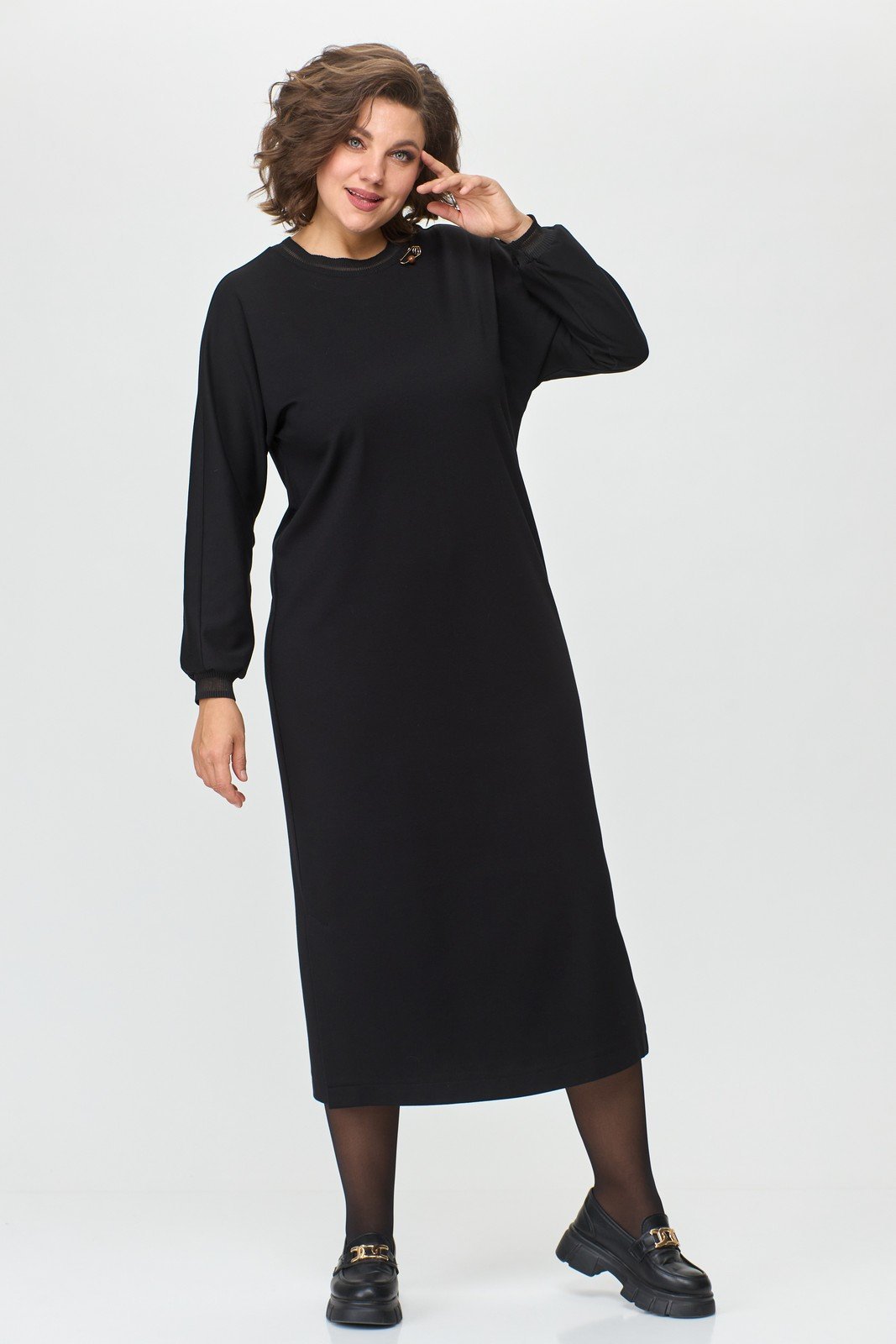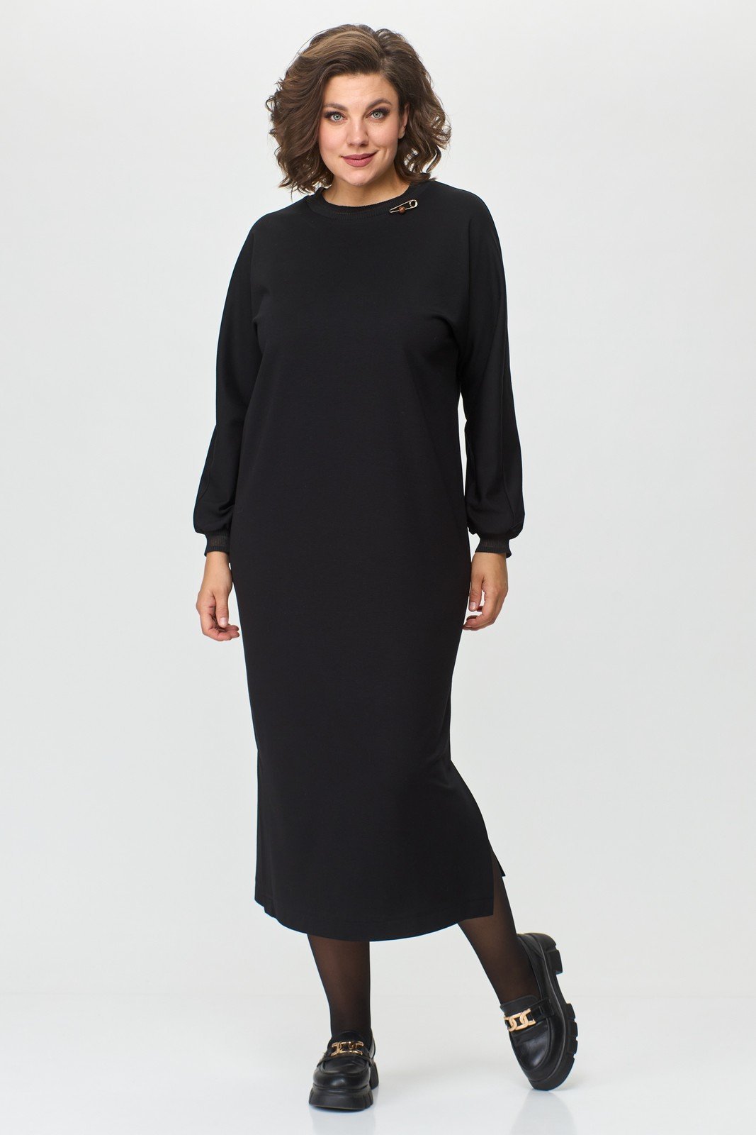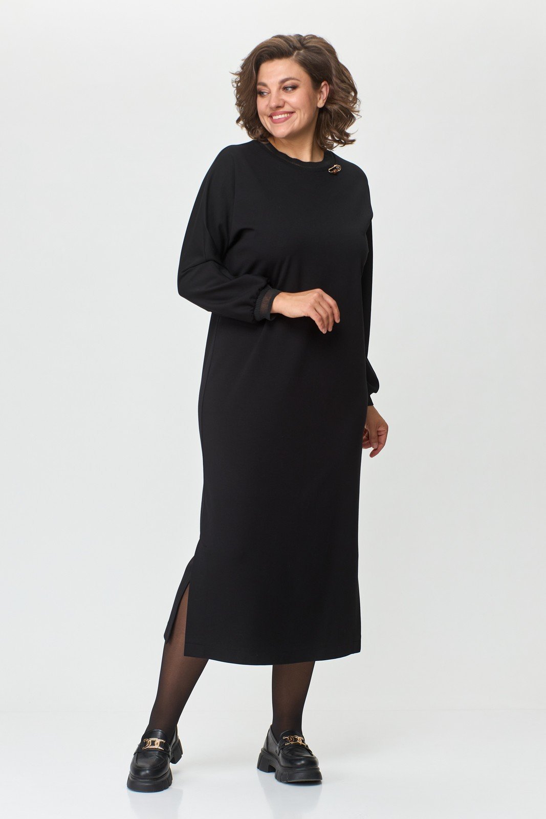 Платье из трикотажного полотна прямого силуэта зауженное к низу с разрезами по боковым швам. По горловине неплотно облегающая шейку стойка из декоративной трикотажной тесьмы. Рукав длинный цельнокроеный, собран на манжетку. Платье без подкладки. Декоративная стильная брошь украшает платье.