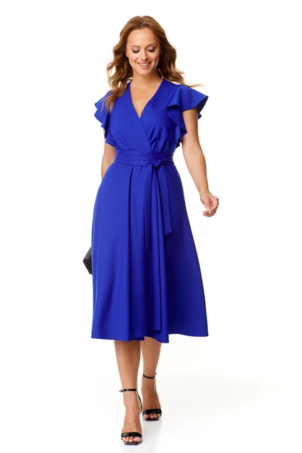 Элегантное соблазнительное платье из плотной непрозрачной ткани, отрезное по талии. Застегивается на две потайные кнопки с глубоким запахом. По спинке средний шов. Плечо прикрывает волан. Юбка «полусолнце» распахивается по переду. Пояс съемный длинный.
