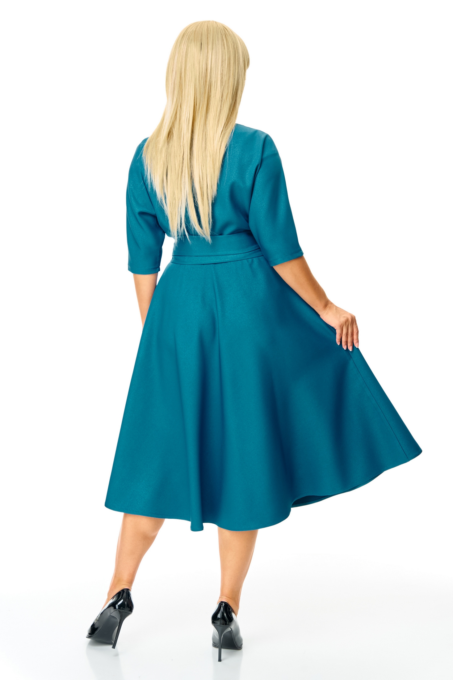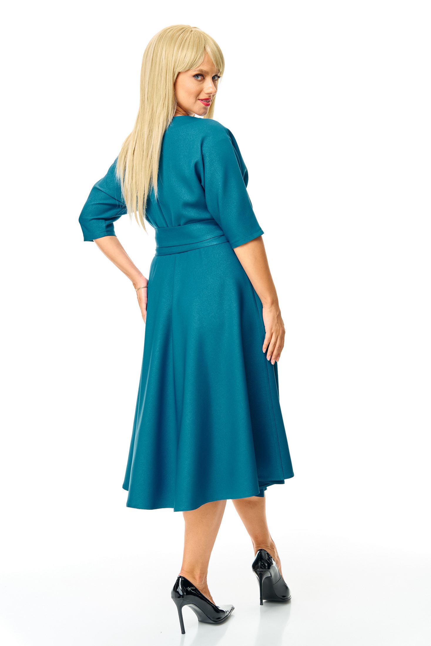 Лиф «летучая мышь» с цельнокроеным рукавом, зауженным к низу. Летящая юбка «полусолнце», по талии эластичная тесьма. Без застежки. Горловина овальная. Пояс длинный, завязывается на талии в два оборота.