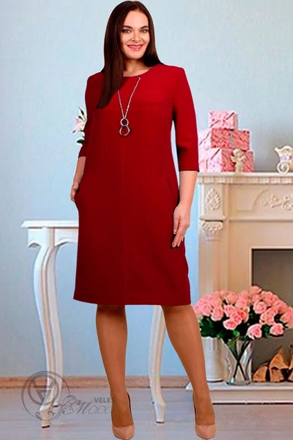 Стильное однотонное платье. Платье слегка расширено книзу, на переде обработаны два внутренних кармана с листочками. Спинка немного удлинена по отношению к переду. Стильным акцентом служит украшение(возможна замена на другой вариант). Длина от центра горловины спинки до низа для размера 56 - 103-105 см, а для 58,60,62,64 - 110 см.