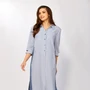 Элегантное платье с нежной вышивкой на горловине выполнено из стрейчевой плательной ткани с эффектом мерцания. Перед с кокеткой и рельефными швами. Спинка со средним швом и талиевыми вытачками, слегка удлинена по отношению к переду. Длина от центра горловины спинки до низа для 56 р-ра - 104,5 см, для 58,60,62,64 р-ров - 108 см, длина рукава - 47 см.