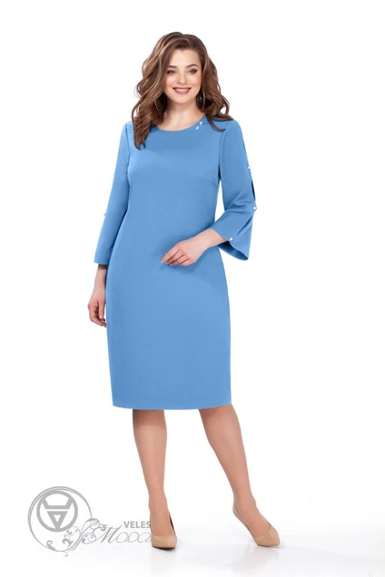 Платье прямого силуэта с втачным рукавом, слегка расширенным к низу. Спинка со средним швом с молнией, внизу разрез, вверху небольшая капелька с застежкой на пуговицу. По верхнему срезу рукава отделаны фигурным кроем с декоративными пуговицами. Вырез горловины круглый. Длина изделия – 107 см., длина рукава – 46 см.