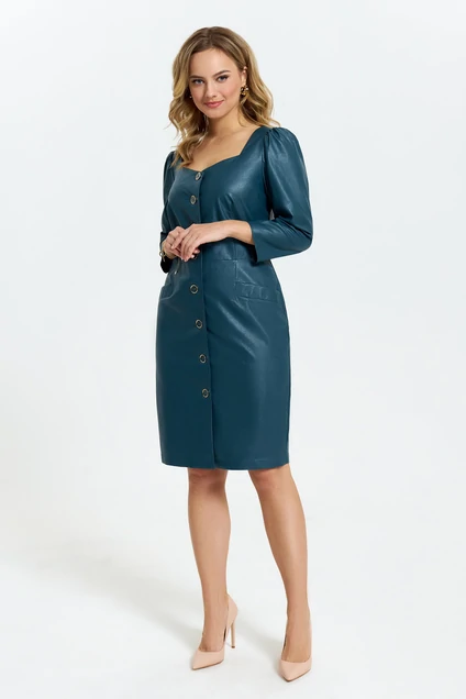 Платье полуприлегающего силуэта из эко-кожи. Рукав втачной длиной 5/6. Фигурный вырез горловины, центральная застежка на пуговицы до низа. Отрезная талия, выточки по спинке и переду, иммитация карманов с листочками. Платье без подкладки.