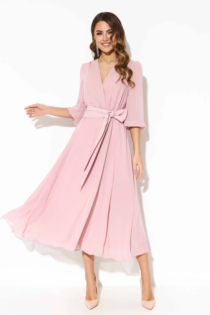 Летящее платье полуприлегающего силуэта из легкой струящейся ткани. Рукав втачной, с небольшой сборкой по окату, длиной ¾, внизу на резинке. Отрезное по талии на резинке, с v-образным вырезом горловины. С фиксированным запахом по лифу и юбке. Платье на подкладке. Есть съемный пояс.