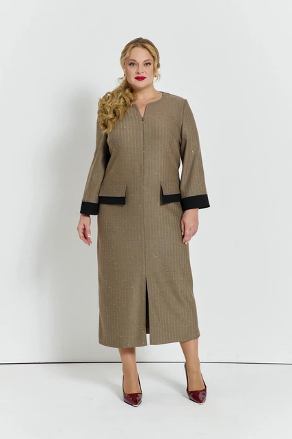 Платье полуприлегающего силуэта с декоративными клапанами , разрезом спереди и шлицей на спинке. Горловина округлая с фигурным оформлением выреза спереди. В среднем шве спереди обработана потайная молния. Рукава расширены к низу и декорированы тканью другого цвета.