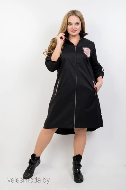 Прямое платье из х/б плащевки с удлиненной спинкой и воротником-стойкой. На полочках карманы с накладными листочками. На спинке декорированный подрез по талии и трендовые расклешение из двух ярусов. Дополнительные блестящие точечные акценты в углах кокеток, листочек по центру спинки и рукавах хорошо сочетаются с застежкой-молнией по переду.