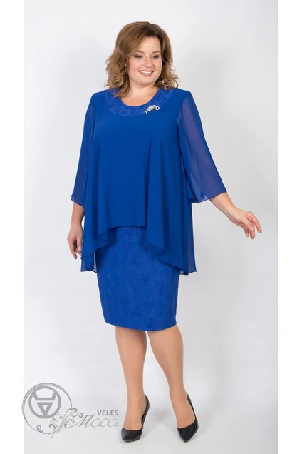 Яркое нарядное платье из трикотажного полотна с жаккардовым узором полуприлегающего силуэта, зауженное к низу со шлицей в среднем шве спинки, широкой округлой планкой у горловины и летящей отлетной частью с фигурным низом. Расклешение в низу рукава также выполнено из шифона. Платье дополнено оригинальной подвеской на цепочке. Длина изделия - 103 см, рукава - 48 см.