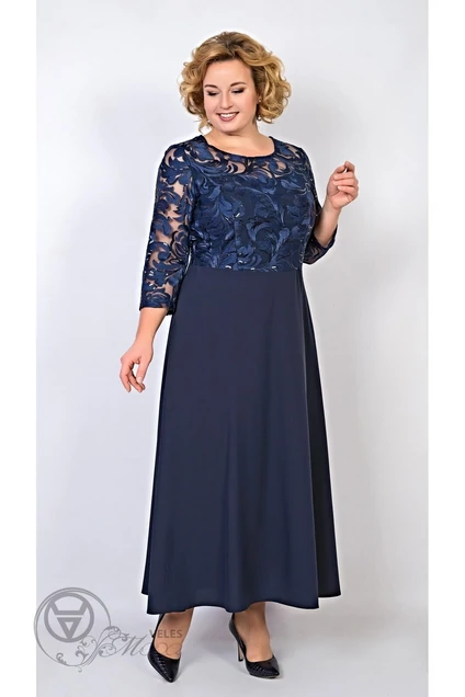Нарядное платье отрезное по линии талии с удлиненной расклешенной юбкой из однотонного легкого полотна. Верхняя часть полотна и рукава выполнены из ажура расшитого шелком и пайетками. Внутренние однотонные детали платья красиво очерчивают декольте, а длинная потайная молния в среднем шве спинки обеспечивает комфорт. Подклада нет. Длина изделия - 130 см.
