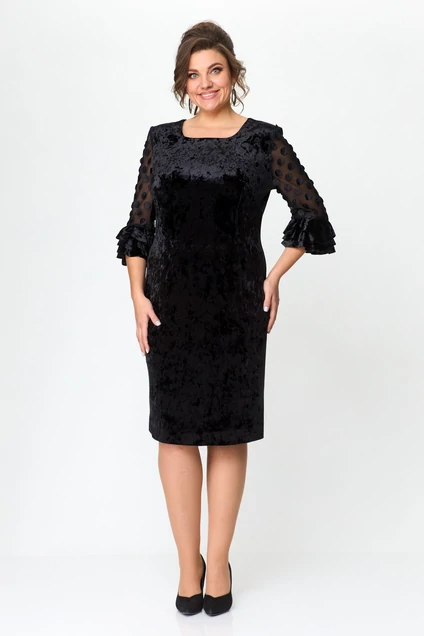 Платье женское прилегающего силуэта. Вырез горловины квадратный на полочке, на спинке "В-образный". В центральном шве спинки декоративная молния. Рукава втачные из отделочной ткани. Низ рукава обработан двойными воланами типа "кармен". Талию подчеркивает декоративный пояс. Длина платья по спинке от плеча - 105 см. Длина рукава - 42 см.