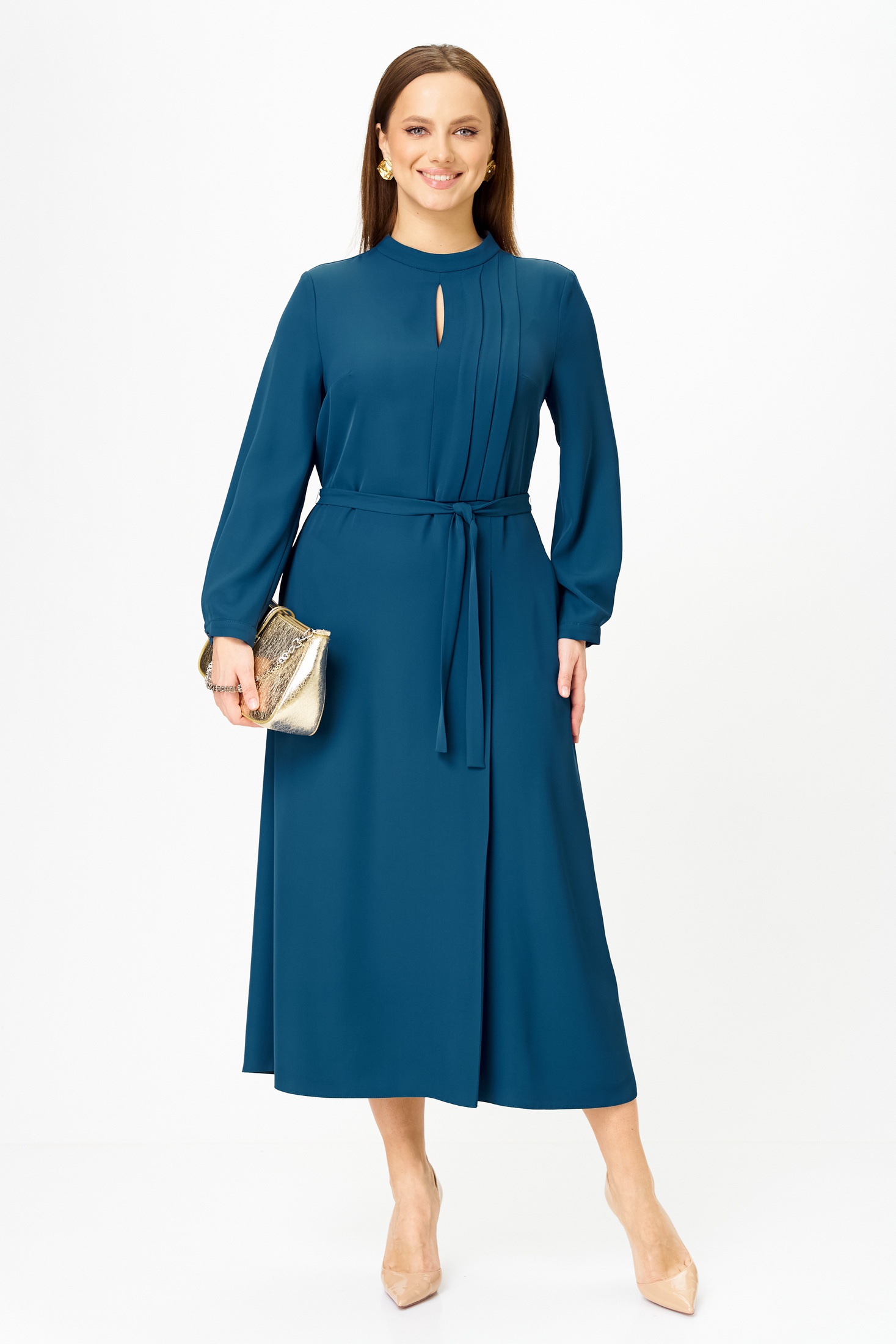 Платье 7891 Tvin идеально подчеркнет вашу индивидуальность. Коллекция бренда Tvin предлагает женское платье полуприлегающего силуэта, отрезное по линии талии, с расширенной миди юбкой. Изделие изготовлено из полиэстера и спандекса, обеспечивающих комфорт и легкость в носке. Ассиметричная деталь на лифе с вертикальными складками и разрезом создает оригинальный акцент, а втачные рукава на манжете добавляют стильности. Округлая горловина с воротником-стойкой завершает утонченный образ. Платье подходит для весеннее-летнего сезона и прекрасно для офисных и праздничных мероприятий. Дополняет дизайн съемный пояс из основной ткани, а функциональные карманы в боковых швах добавляют практичности. Длина по спинке составляет 125 см.