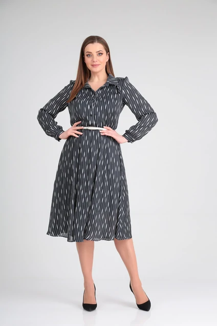 Платье женское свободного покроя из блузочно-плательной ткани (шифон), отрезное по линии талии (собрано на эластичную тесьму), юбка клешёная. По переду по центру застёжка на петли-пуговицы; спереди кокетка и встречная складка. По лифу спинки кокетка с небольшой сборкой. Воротник рубашечного типа на стойке. Рукав длинный втачной, со сборкой; на манжете с пуговицей. Подкладка в виде отдельного платья на бретелях из тонкого трикотажного полотна. В комплект входит съёмный пояс. Длина изделия (от талии) – 74 см. Длина рукава – 62 см