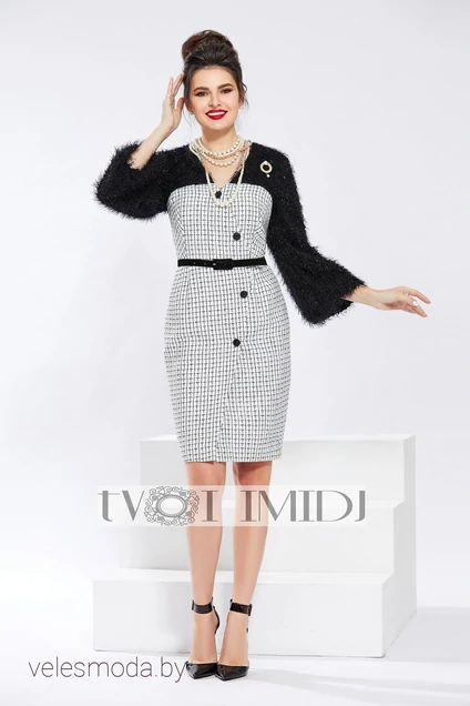 Роскошно и умопомрочительно — именно так будут говорить о Вашем образе, когда Вы появитесь в этом платье! Ведь что может больше украсить женщину, чем сногсшибательный наряд, в котором она способна почувствовать себя королевой!? Шикарное платье, от которого невозможно отвести глаз, создано специально для торжественных мероприятий, вечеринок, важных моментов и ярких событий. Платье женское полуприлегающего силуэта втачного покроя с застёжкой на запах двубортной, переходящей в V-образную горловину и по низу в косой разрез, фиксирующаяся по талии по шву и декоративными пуговицами по линии застёжки. Платье состоит из двух тканей: трикотаж «травка», и плательная «шанель». Комбинирование двух этих тканей создаёт вречатление, что это двойка, состоящая из «болеро» и платья. Перед состоит из кокетки, средней части и нижней частей переда. Спинка состоит из кокетки и нижней части со средним швом, в котором расположена молния. По спинке расположены вертикальные талиевые вытачки. По переду в средней части расположены нагрудные вытачки, в нижней части складки. В боковом шве расположены карманы. Рукава одношовные, расширенные к низу, на подкладке. Платье полностью на подкладке. Длина по спинке 97 см, рукав 52 см.