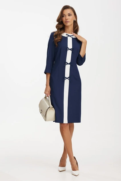 Платье полуприлегающего силуэта, выполнено из смесовой плательно-костюмной ткани. Рукав 3/4 с притачной манжетой. Перед платья с декоративной планкой и обтачкой из ткани контрастного цвета. По планке — декоративные бантики. Перед и спинка платья с талиевыми вытачками. По спинке в среднем шве обработана потайная молния. В боковых швах платья обработаны карманы.