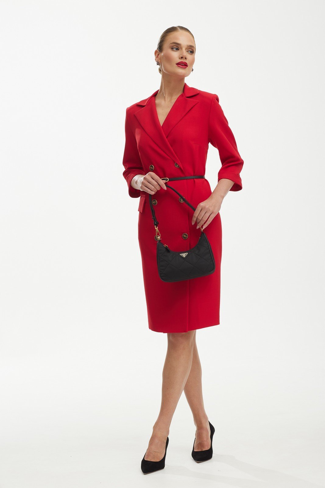 Платье женское, полуприлегающего силуэта, с двубортной застежкой на петли - пуговицы. Платье выполнено из ткани костюмно-плательной группы. По переду нагрудные выточки, в области бедер обработаны прорезные карманы с клапаном. Спинка с талиевыми вытачками. Рукава двухшовные, длиной 3/4, с притачной манжетой. Горловина оформлена воротником пиджачного типа. В комплект входит съёмный пояс.
