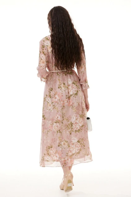Платье А- силуэта длиной мидакси, на трикотажной подкладке, выполненное из итальянского шифона, с цветочным принтом. Перед и спинка платья цельнокроеные, перед с нагрудными выточками. Горловина круглой формы, по центру обработана капелька с завязкой. Рукав втачной, длиной 3/4. По низу рукава обработана манжета, которая застёгивается на петлю и пуговицу. В комплект к платью входит узкий ремень из экокожи, который позволяет подчеркнуть силуэт. Шифоновое платье – прекрасный выбор для яркого весеннего либо летнего образа. Воздушная фактура этого материала, который со стороны кажется невесомым, придает необычайную легкость и игривость. Платье представлено в нежном пудровом оттенке, который легко комбинируется с различными аксессуарами и обувью. Оно отлично подойдёт как для повседневного ношения, так и для более торжественных случаев. Если вы ищете платье для выпускного, свадебного торжества или вечеринки, данная модель станет вашим надежным спутником.