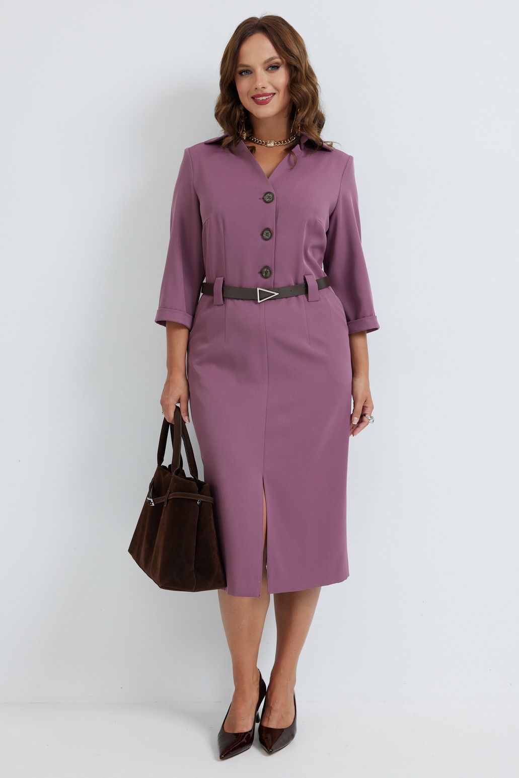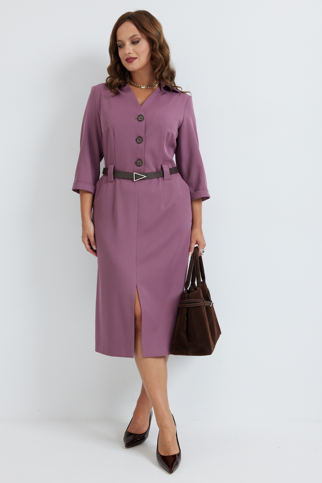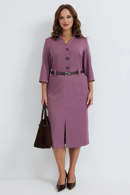 Платье полуприлегающего силуэта, выполненное из плательной поливискозы, длиной 'мидакси". Платье отрезное по линии талии, с центральной застёжкой на петли и пуговицы. Верхняя часть переда платья с фигурной V-образной горловиной, оформленной воротником рубашечного типа. Верхняя часть платья с нагрудными и талиевыми выточками. Нижняя часть переда платья с талиевыми вытачками и со средним швом, внизу которого обработан разрез. Спинка цельнокроеная с талиевыми вытачками. В боковом шве обработана потайная молния в области талии, в области бедер обработаны карманы. Рукав втачной, с цельнокроеной манжетой, длиной 3/4. В комплект к платью входит контрастный ремень с декоративной пряжкой.