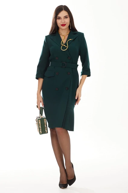 Платье женское полуприлегающего силуэта с двухбортной застёжкой на петли и пуговицы. По переду расположены нагрудные вытачки. На левой части переда - горизонтальный подрез с планкой. Нижняя часть оформлена заутюженными складками, направленными к боковому шву. По правой части переда, в области бедер, расположен горизонтальный прорезной карман с листочкой и клапаном. Спинка цельная с вертикальными талиевыми вытачками. Рукав двухшовный, длиной 3/4, с манжетой по низу рукава. Горловина платья оформлена воротником жакетного типа. В комплект к платью идёт пояс из основной ткани с декоративной пряжкой.