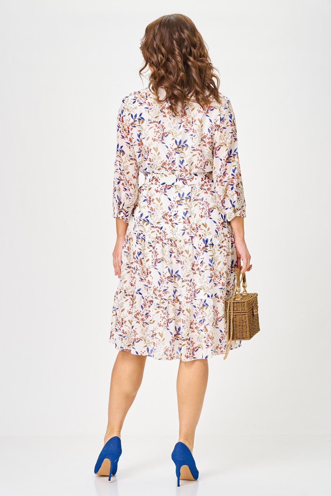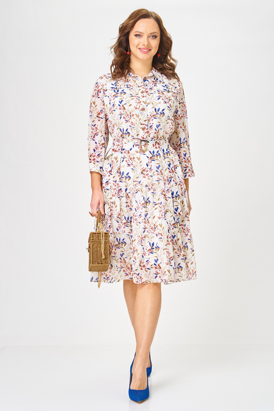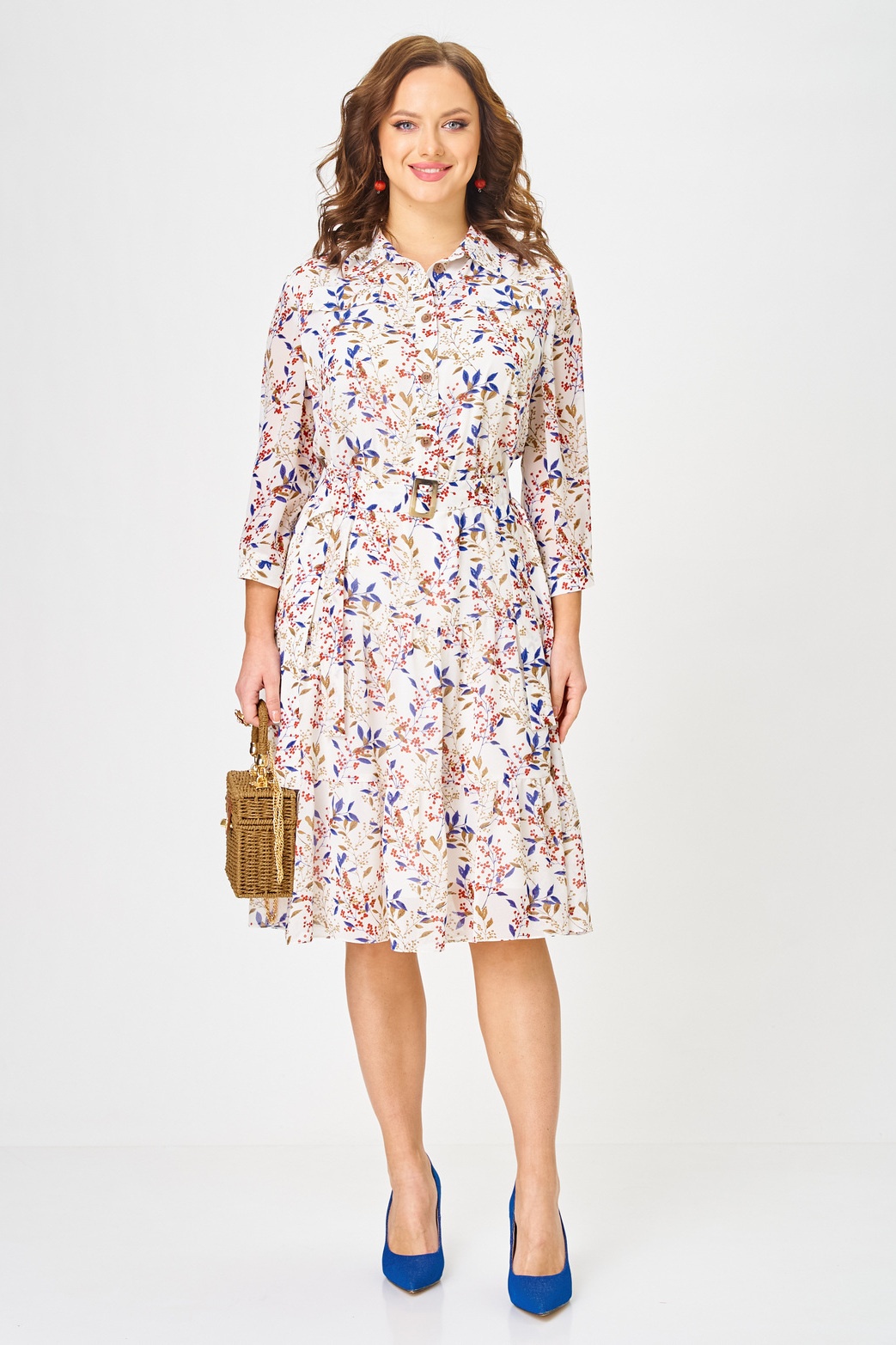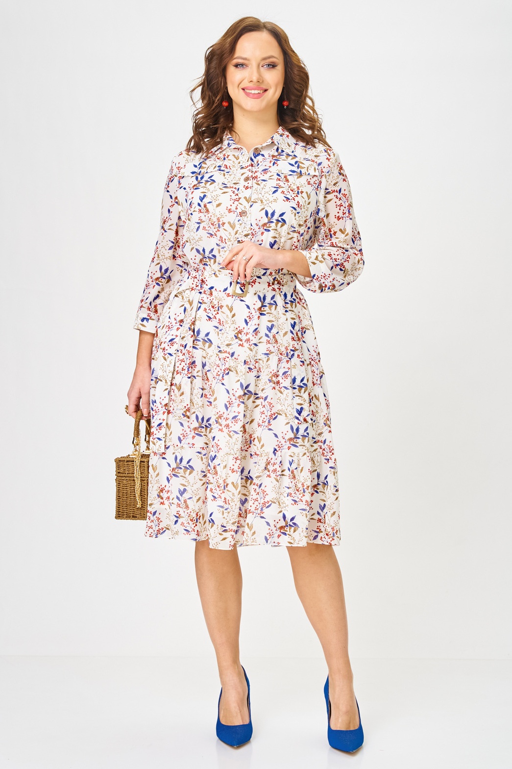Платье 2340 молочный с принтом Твой Имидж. Коллекция бренда Твой Имидж предлагает элегантное платье полуприлегающего силуэта из шифона с подкладкой. Материал легкий и воздушный, обеспечивающий комфорт в любое время года. Особенностью является воротник со стойкой и нагрудные выточки, добавляющие изысканности. Декоративная тесьма на талии и планка на пуговицах придают образу завершенность. Короткие рукава с манжетами и пояс из основной ткани делают платье идеальным как для повседневного, так и для праздничного образа. Молочный цвет с красочным принтом гармонично дополняет легкость и романтичность стиля.
