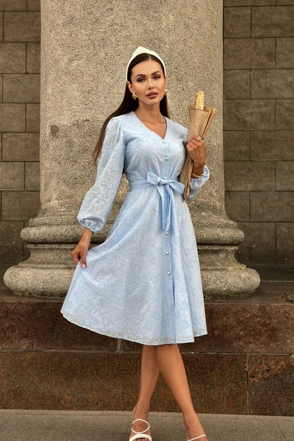 Платье полуприлегающего силуэта на подкладке, выполнено из 100% хлопковой ткани. Длина миди. Платье отрезное по линии талии. Лиф облегающей формы. Юбка со сборкой по линии талии, расширена к низу. Оригинальный втачной рукав фонарик, короткий, расширенный к низу на резинке. Спинка с отрезной кокеткой. Застежка на петли и пуговицы.В комплекте съемный ремень.