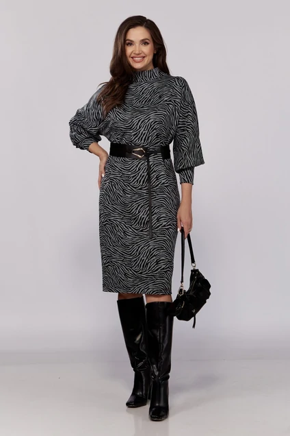 Трикотажное платье свободного силуэта с рукавом летучая мышь. Рукав со складками на манжете, воротник стойка. Молния в среднем шве спинки. Платье без подкладки, в комплекте пояс из экокожи.