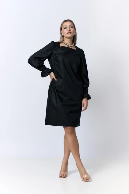 Платье женское прямого кроя. Горловина “КАРЭ”. Рукав втачной,прямой. Низ рукава декорирован буфами. Спинка со средним швом. Застежка на молнию. Изделие с поясом в комплекте.