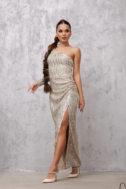 «пайетки». Длина макси. Платье на одно плечо. Рукав длинный, узкий. В боковом