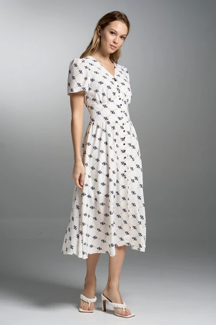 Платье женское приталенного силуэта расклешённое книзу на трикотажной подкладке.Центральная бортовая застёжка на петли-пуговицы.Полочка и спинка отрезные по талии с притачным поясом.Центральная часть пояса спинки прострочена резинкой "венгерка".