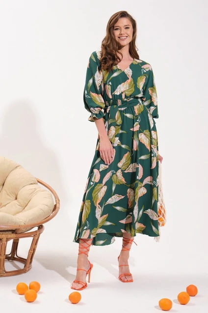 Платье женское расклешённого силуэта отрезное по талии. Отрезной пояс платья собран на резинку "венгерка" для прилегания по линии талии. Горловина переда V-образная. Рукава цельнокроеные с кулисой и вставленной в нее резинкой. Имеется навесной пояс из основной ткани. В боковых швах имеются карманы.