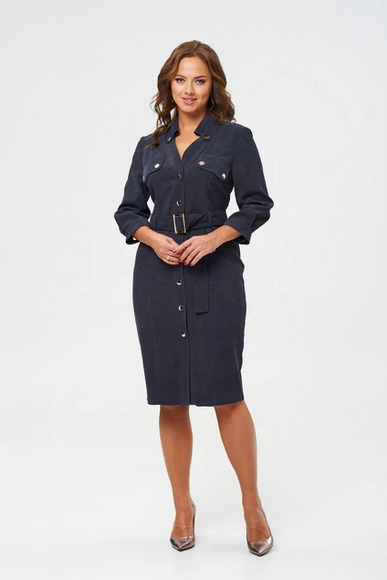 Платье женское полуприлегающего силуэта зауженное книзу. Центральная бортовая застёжка с планкой на кнопки. Полочка и спинка с рельефами и отделочными строчками. Полочка с накладными клапанами с застёжкой на кнопки.
