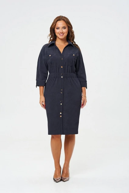 Платье женское полуприлегающего силуэта, заужено к низу. Рукав цельнокроеный типа "летучая мышь" длиной 3/4. Низ рукава с манжетой и патой. Горловина обработана блузочным воротником на отрезной стойке. Перед с планкой и застежкой на петли-пуговицы. По переду настрочены нагрудные карманы со встречной складкой. Перед и спинка с отрезными кокетками. В боковых швах карманы. Для придания силуэтности платью, по линии талии настрочена кулиса с резинкой.
