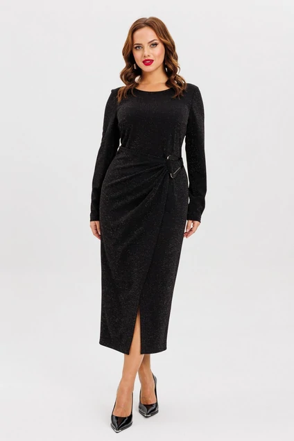 Модель с люрексом. Платье женское полуприлегающего силуэта, заужено к низу.Рукав длинный, втачной, одношовный.Горловина округлой формы.Перед ассиметричный с запахом, драпировкой и декоративной пряжкой.Передние полотнища при ходьбе распахиваются и образуют разрез.Спинка со средним швом, талиевыми вытачками и застежкой на тесьму-молнию.Горловина обработана бейкой из подкладочной ткани 100% хлопка.