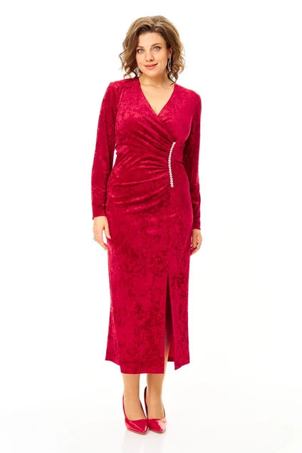 Платье женское из велюра. Платье женское полуприлегающего силуэта, заужено к низу. Рукав длинный, втачной, одношовный. По переду горловина V-образной формы. Перед ассиметричный. Слева выполнен рельеф, заканчивающийся высоким разрезом. В рельеф вставлена правая часть переда с легкими складками и нашита декоративная метализированная декоративная тесьма со стразами. Спинка со средним швом, талиевыми вытачками и застежкой на тесьму-молнию. Горловина обработана бейкой из подкладочной ткани 100% хлопка.