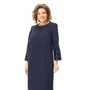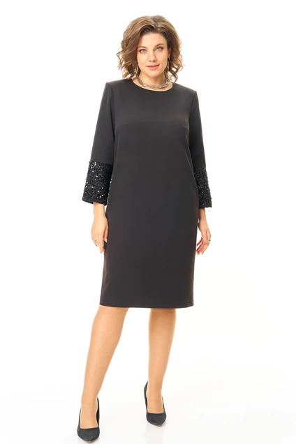 Платье прямого силуэта с естественной линией плеча.Спинка со средним швом и застежкой на молнию.В среднем шве спинки выполнена шлица.Перед с нагрудными вытачками.Вырез горловины округлой формы.Рукав втачной одношовный длиной 5/8.Низ рукава обработан манжетой и ткани с пайетками.В боковых швах обработаны карманы.
