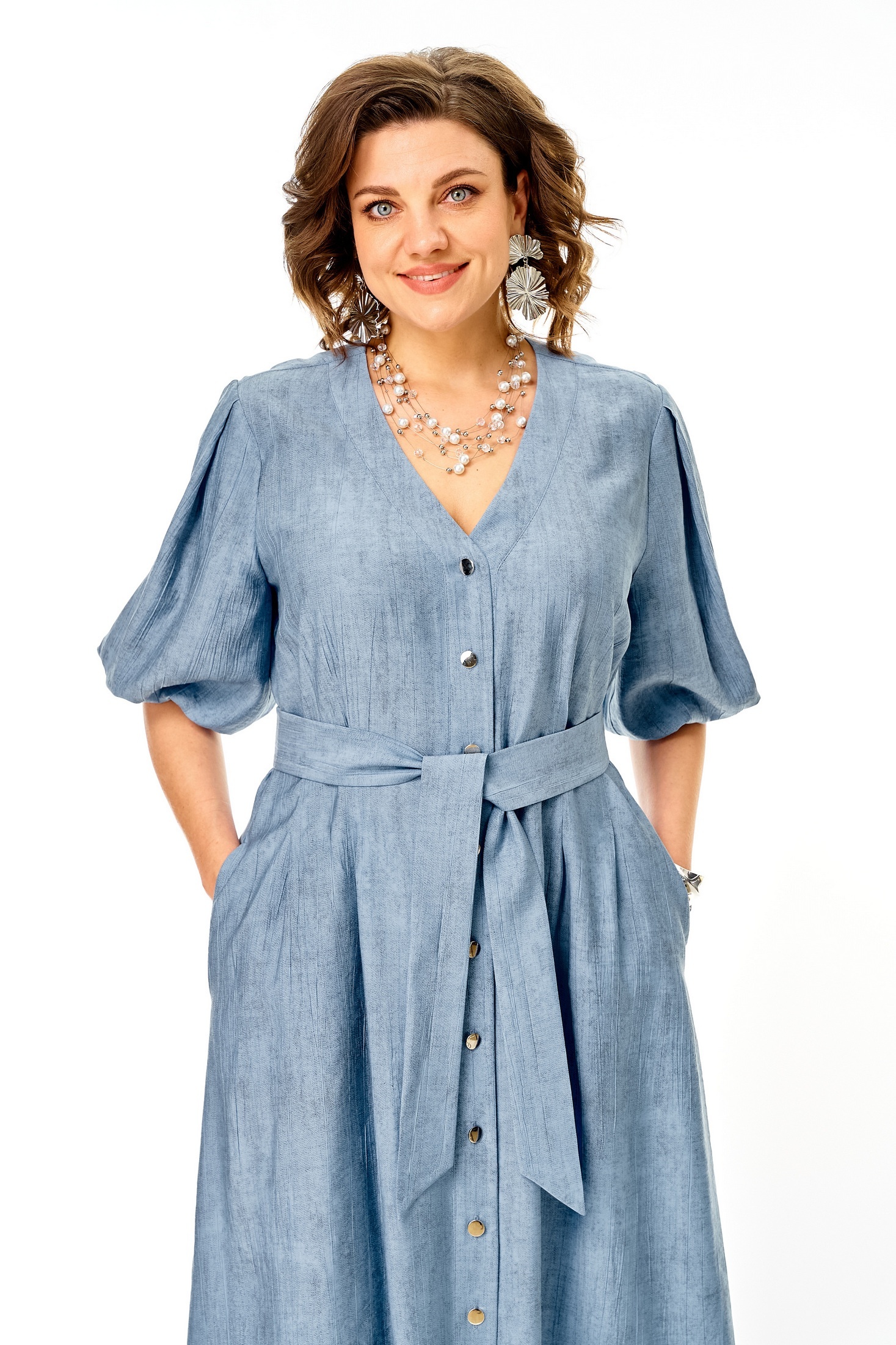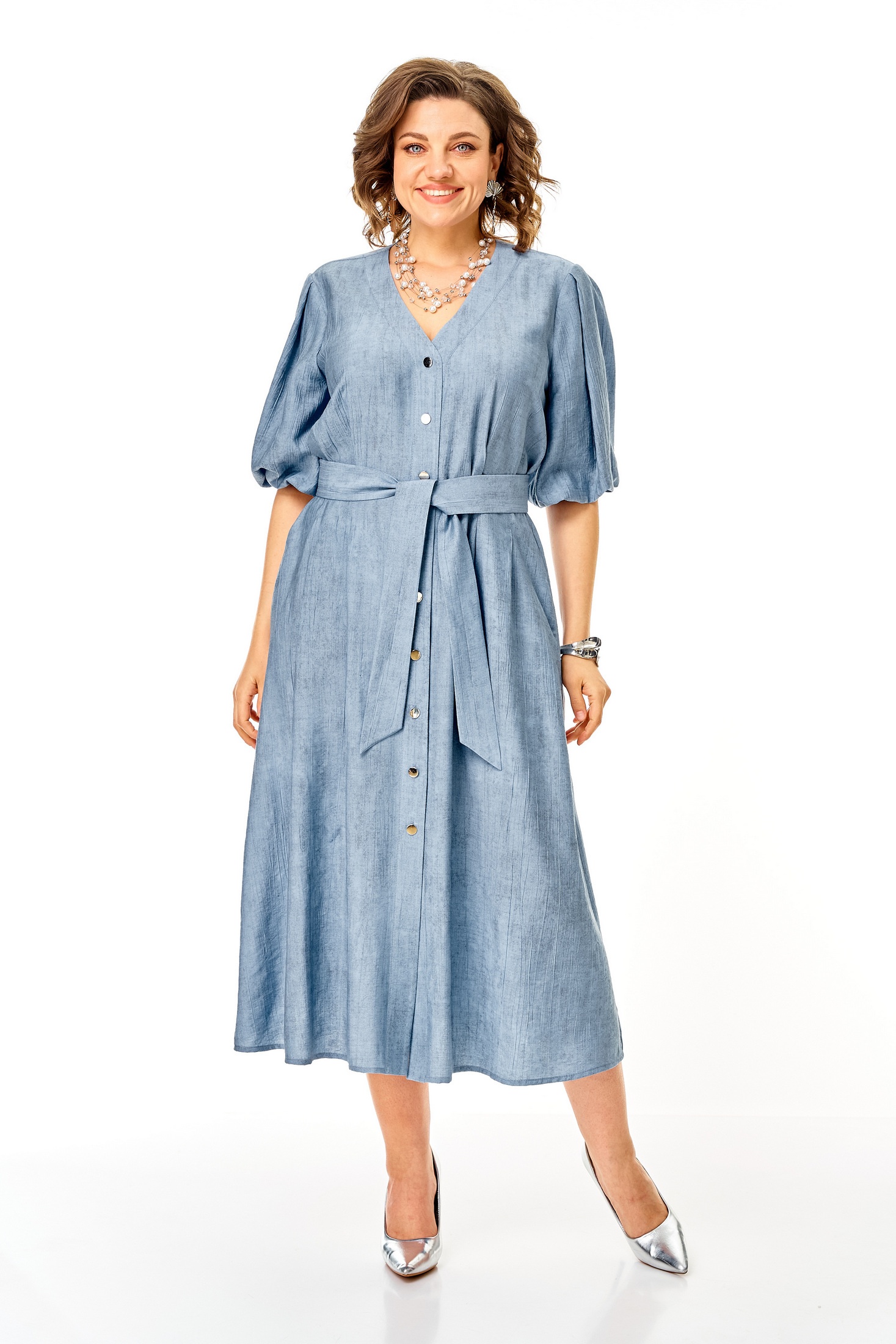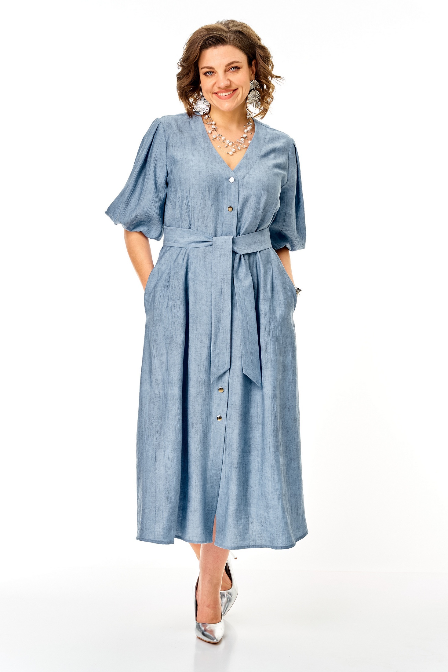 Платье 1275 голубой от VI ORO идеально дополнит ваш гардероб. Коллекция бренда VI ORO воплощает легкость и практичность. Изготовленное из вискозы с добавлением нейлона, оно приятно к телу и обеспечивает комфорт в ежедневной носке. Свободный покрой с легким расклешением к низу придает образу женственность, а естественная линия плеча и втачной рукав добавляют элегантности. Застежка на петли-пуговицы и карманы в боковых швах функциональны и практичны. Платье голубого цвета подходит для повседневного стиля и идеального летнего настроения. Длина миди делает его универсальным выбором как для рабочего дня, так и для отдыха.